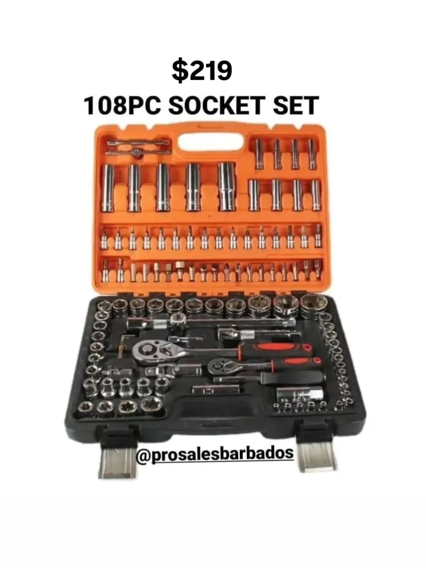 This is a 108-piece socket set, ideal for various mechanical tasks. The set includes a variety of sockets and ratchets, all organized in a durable orange and black case. This comprehensive tool kit is suitable for both professional and DIY use.