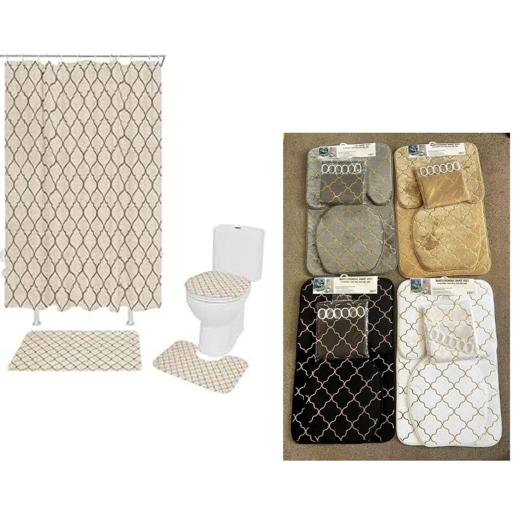This 4-piece bathroom mat set includes two bath mats, a toilet seat cover, and a shower curtain. The set features a geometric quatrefoil pattern. Available in multiple colors and sizes. The shower curtain measures 180x180cm and the bath mats are 50x80cm and 50x40cm.