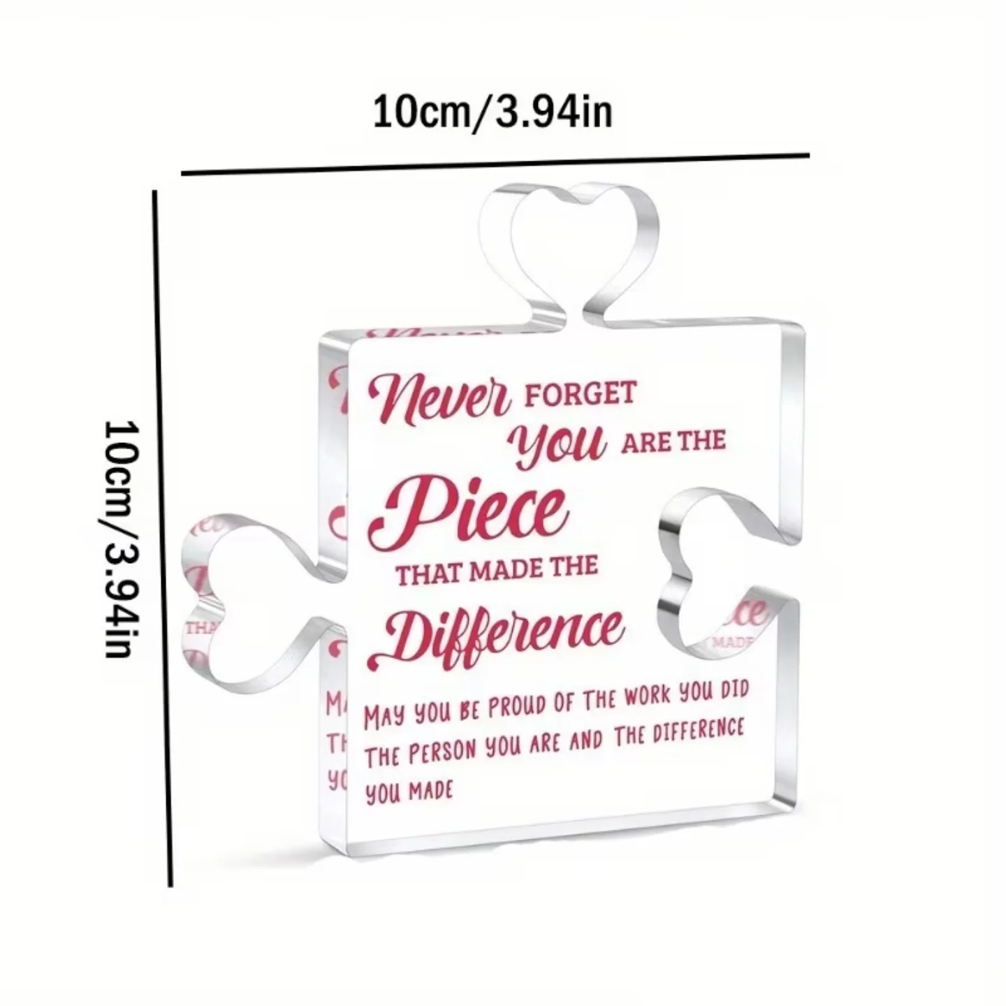 This acrylic puzzle piece is a thoughtful token of appreciation, featuring the message “Never forget you are the piece that made the difference.” It also includes the sentiment “May you be proud of the work you did, the person you are, and the difference you made.” This gift is ideal for expressing gratitude and acknowledging someone’s impact. Available at Heartening Gifts.