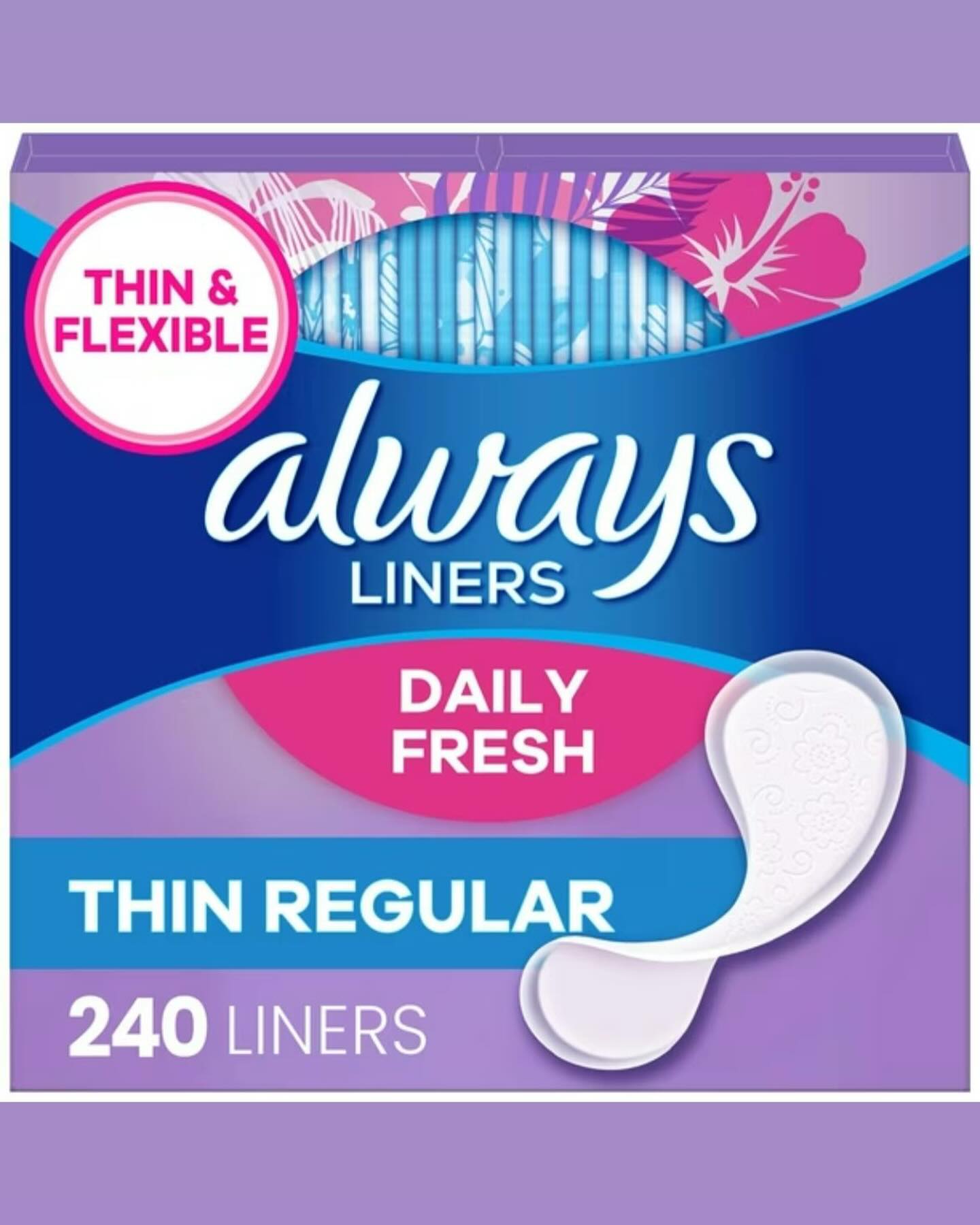 Always Daily Fresh Thin Regular Panty Liners provide discreet and comfortable protection. These thin and flexible liners come in a pack of 240, designed for everyday freshness and feminine hygiene.