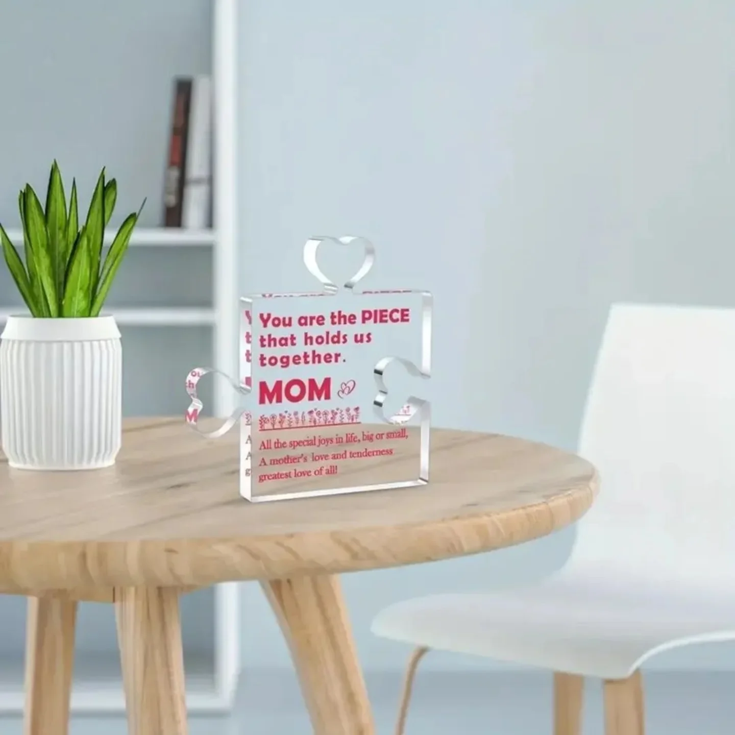 This acrylic puzzle piece is a token of appreciation for Mom, featuring the quote “You are the piece that holds us together.” It also includes the message “All the special joys in life, big or small, A mother’s love and tenderness greatest love of all!”. This meaningful gift is perfect for any mother.