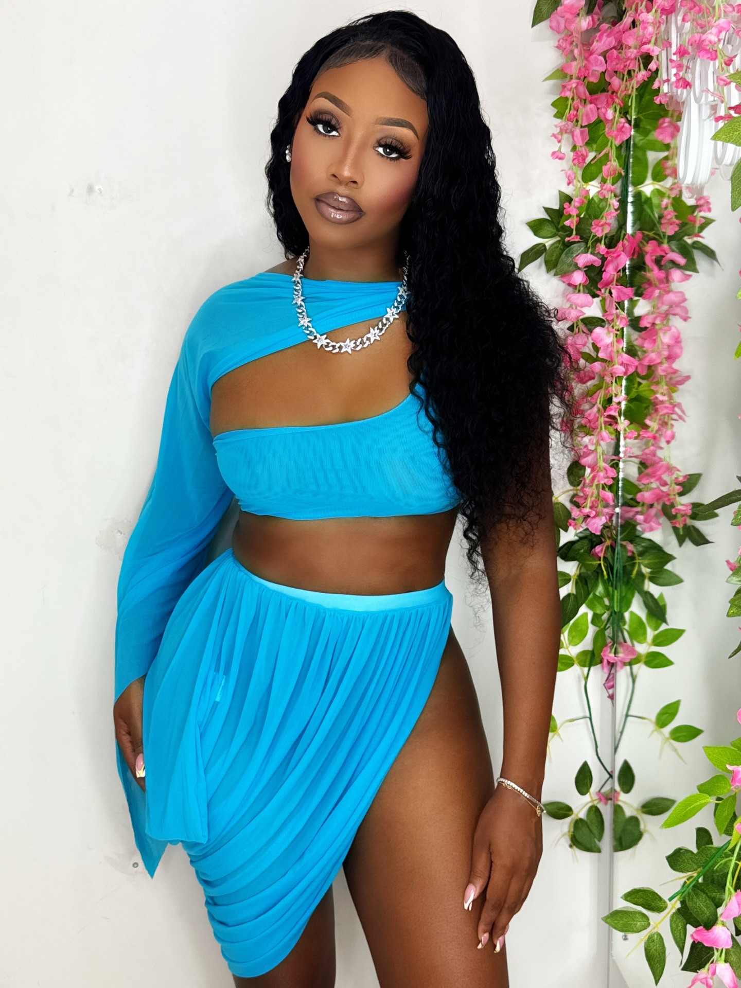 This vibrant aqua two-piece set features a uniquely designed asymmetrical top and a flowing skirt with a high slit. Perfect for a standout look. Available in sizes Small, Medium, and Large.