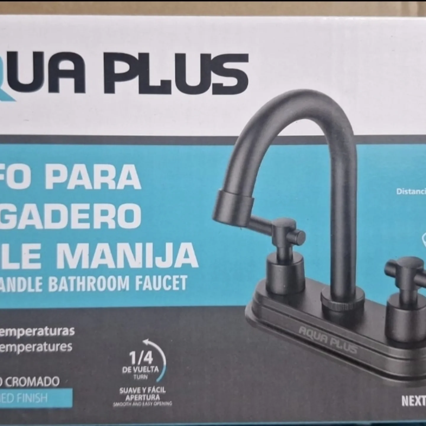 This AQUA PLUS two-handle bathroom faucet features a sleek black finish, perfect for modern bathroom aesthetics. Designed for smooth and easy operation with a 1/4 turn mechanism, it offers both style and functionality for your sink.