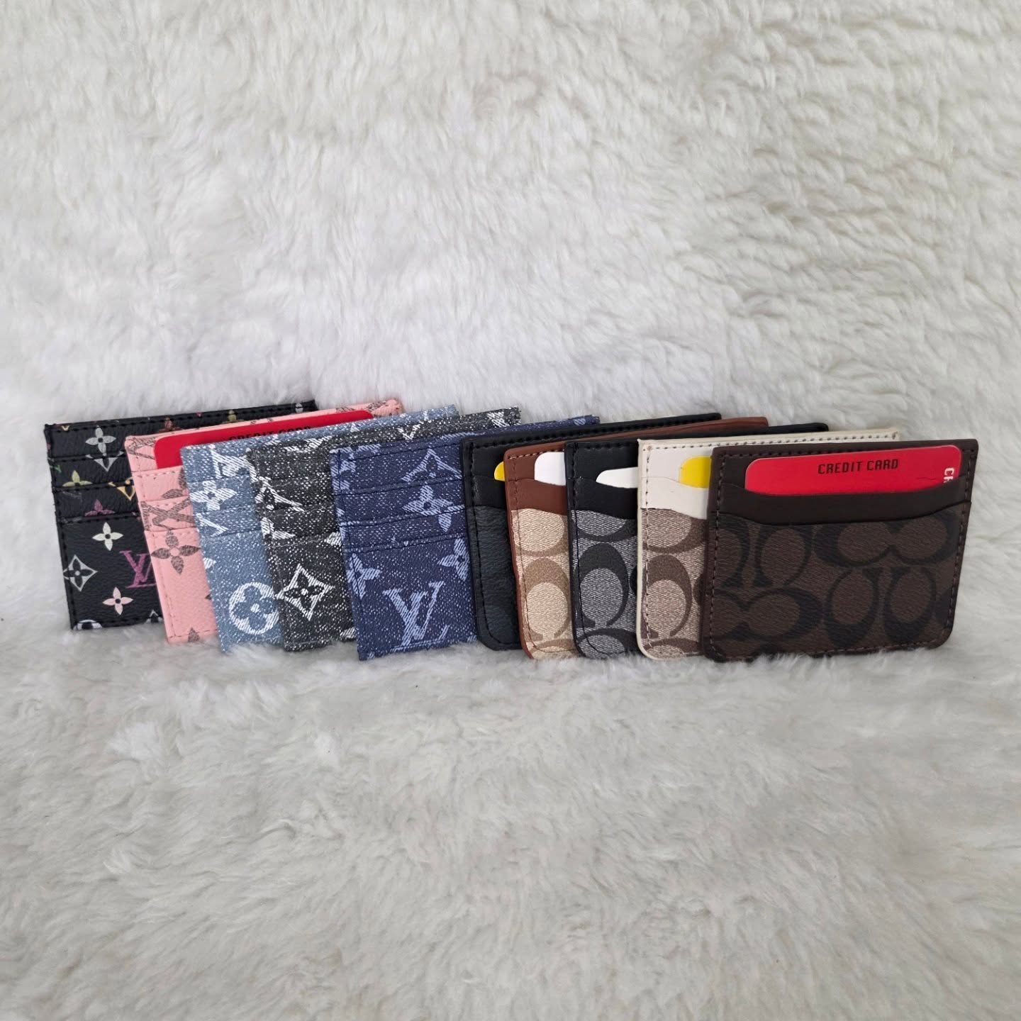 A collection of stylish card holders in various designs and colors. Suitable for securely carrying essential cards. Each holder features a sleek and compact design, perfect for everyday use.