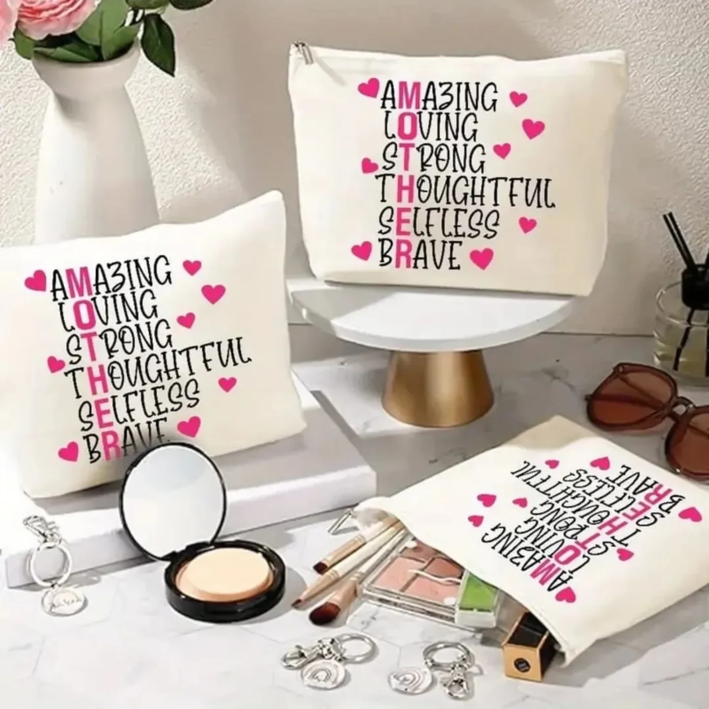 This charming beige canvas pouch is designed as a perfect gift for mothers, featuring a heartfelt ‘MOTHER’ acrostic design with words like Amazing, Loving, Strong, Thoughtful, Selfless, and Brave, accented with pink hearts. Ideal for use as a cosmetic bag, makeup pouch, or travel organizer, it celebrates the special qualities of a mother.