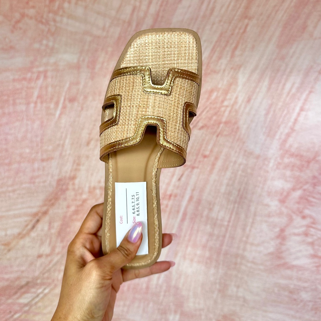 These women’s sandals feature a woven texture and beige color with golden accents. Available in sizes 7 to 11, they offer a blend of style and comfort suitable for various occasions.