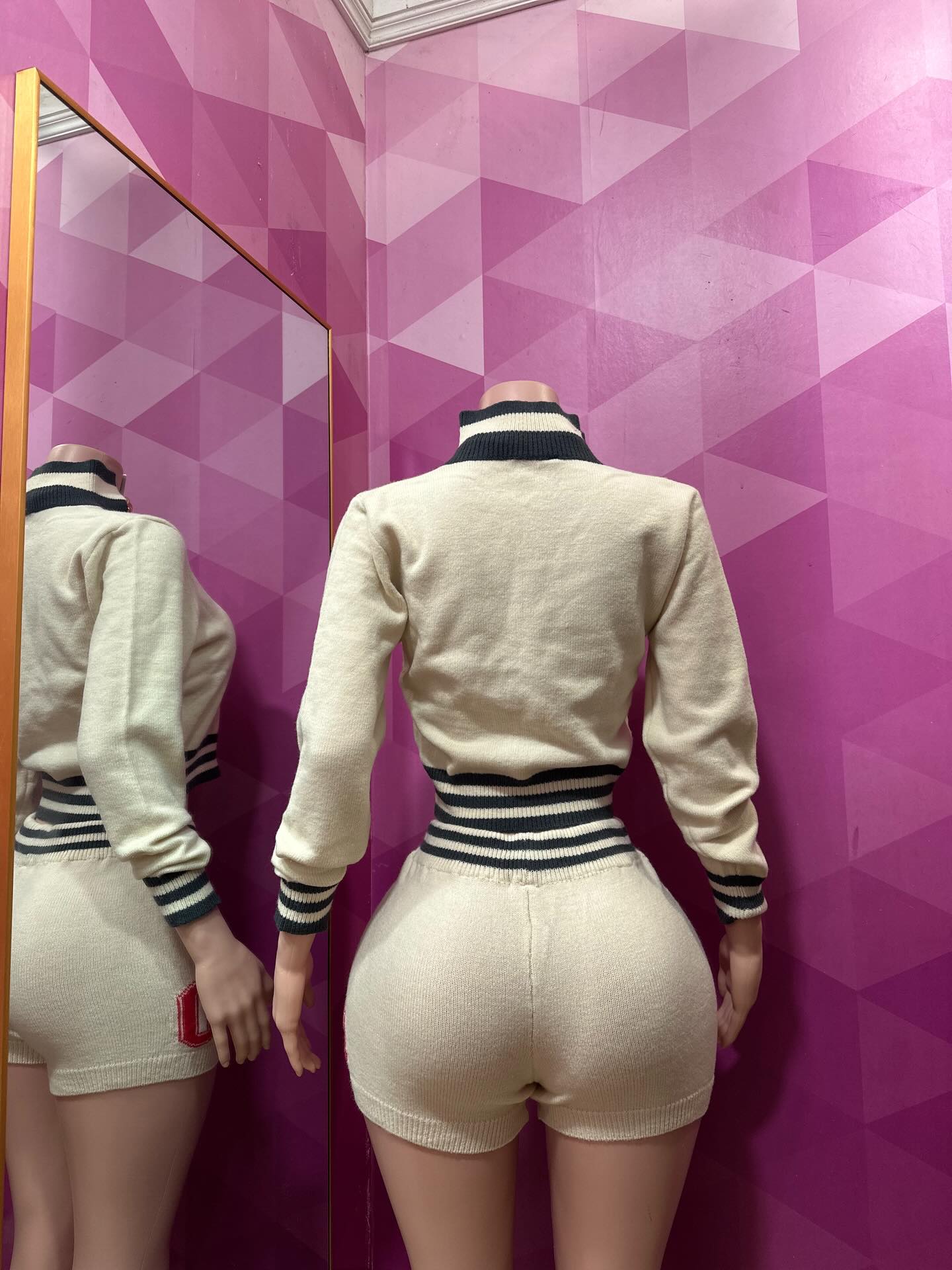 This beige two-piece set for women features a long-sleeve crop top and matching shorts. The top has a unique collar and embroidered number detail, with striped accents on the cuffs and waistband. Available in sizes small, medium, and large.