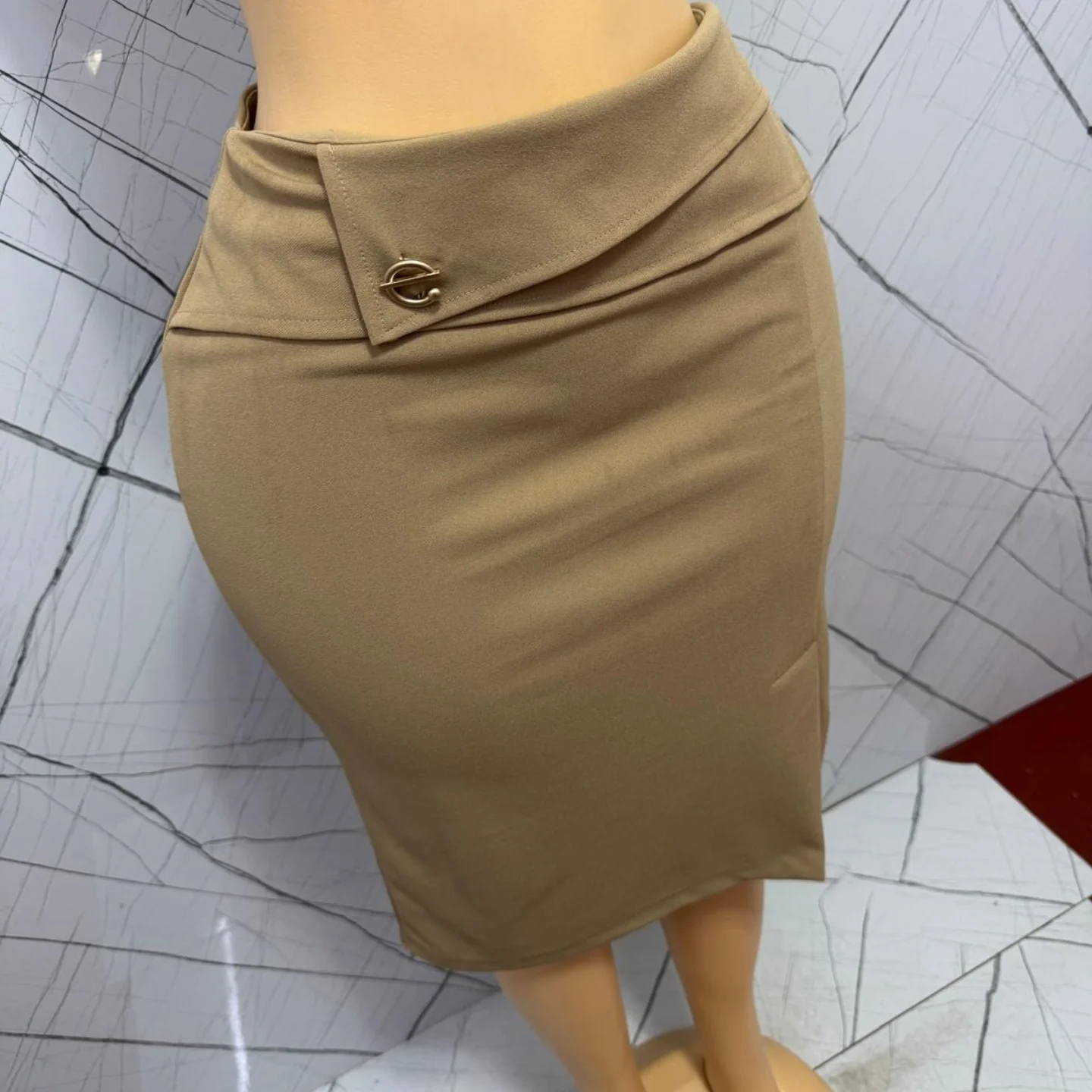 This elegant beige women’s pencil skirt features a tailored fit and a distinctive high-waist design with an overlapping panel and a decorative gold-tone buckle. Crafted from a smooth fabric, it’s a versatile piece perfect for professional work attire.