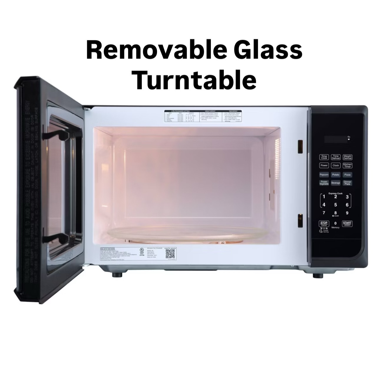 Upgrade your kitchen with the BLACK+DECKER 1.1 Cu. Ft. Microwave Oven in sleek matte black. This microwave is designed for convenience and everyday efficiency, featuring an LED digital display, a removable glass turntable for even heating and easy cleaning, and a child safety lock-out feature. It offers 1000 watts of cooking power with 11 power levels, multiple preset cooking options, and 30-second express cooking. Perfect for reheating, popcorn, or quick meals.