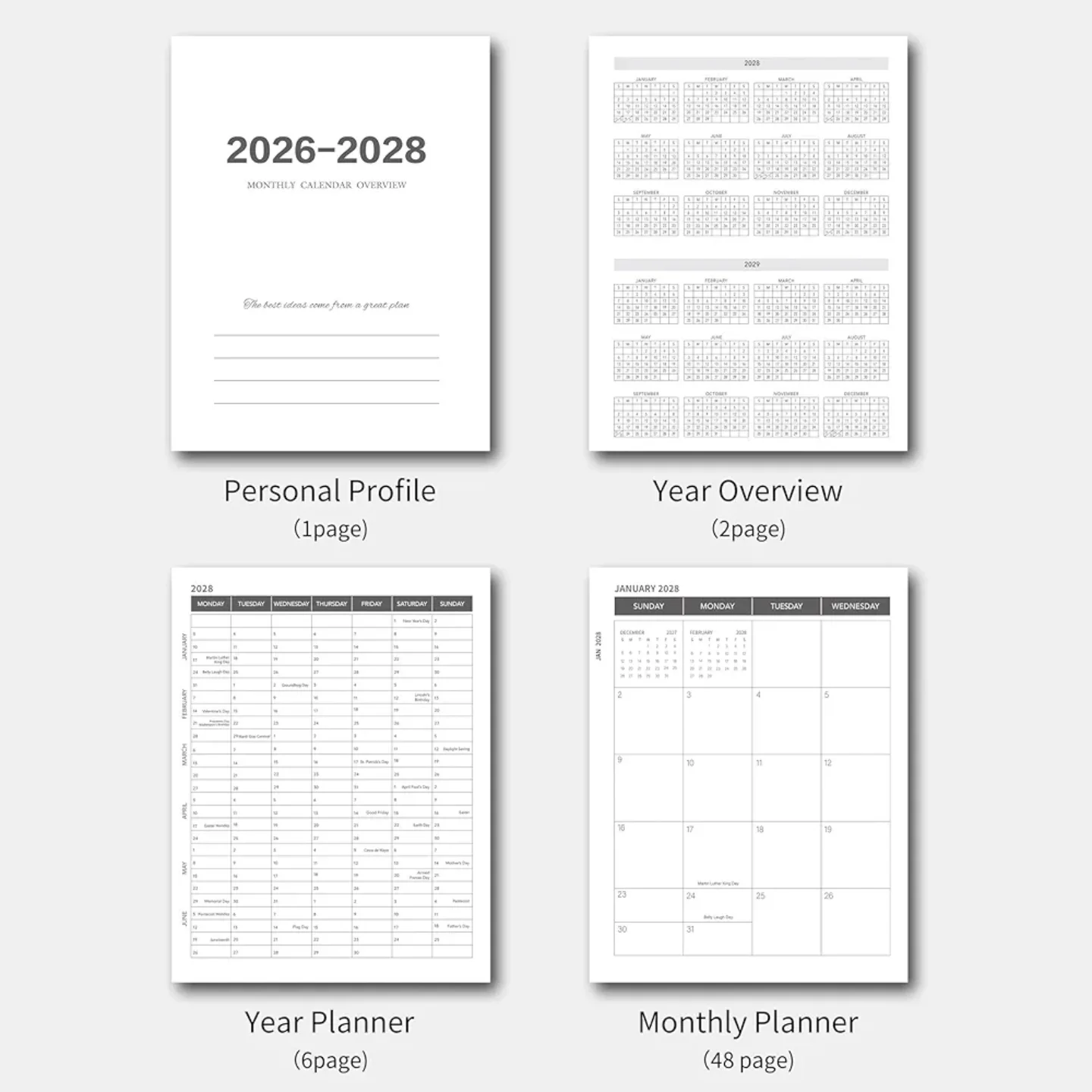 This black spiral-bound executive planner provides three years of monthly organization from January 2026 to December 2028. Designed for effortless time management, it features a clean layout, strong twin-binding, solid metal corner protectors, and 100GSM paper to prevent marker bleed-through, making it ideal for detailed scheduling and planning.