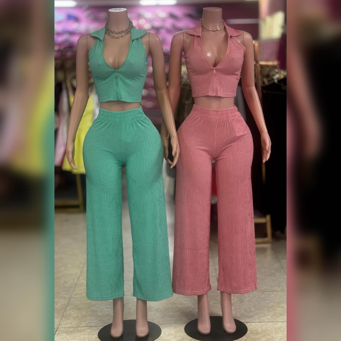 This stylish two-piece set for women features a sleeveless cropped top and wide-leg pants. Available in ribbed fabric, the set comes in black and burgundy, providing a chic and versatile look. Sizes available include S, M, and L.