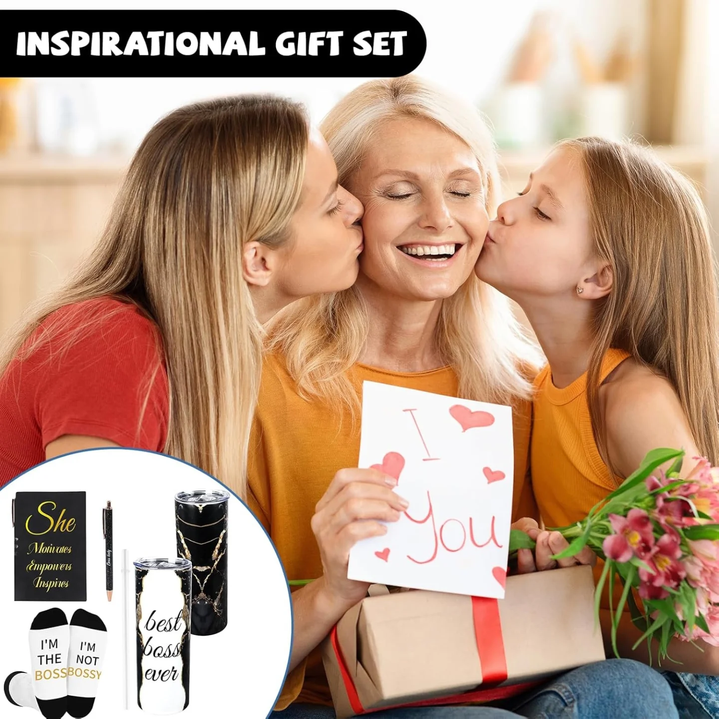 This elegant Black and Gold Boss Appreciation Gift Set includes a 20oz double-wall vacuum insulated stainless steel travel tumbler, a ‘She Motivates Empowers Inspires’ journal with a ‘Boss Lady’ pen, and ‘I’m The Boss / I’m Not Bossy’ socks. It’s a thoughtful collection designed for an awesome and strong boss.