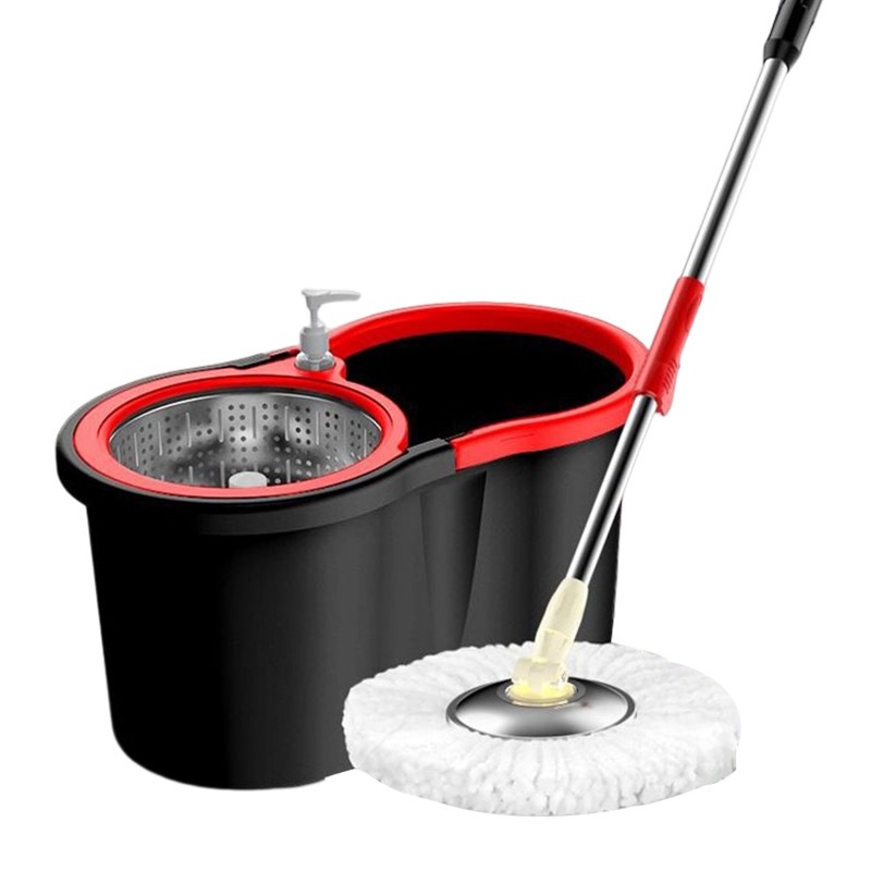 This Black and Red UNIQUE PLUS 360 Spin Mop Set features a durable plastic bucket with a stainless steel spinner and a built-in soap dispenser. It includes a telescopic handle, a white microfiber mop head, and comes with 3 extra cloths for versatile cleaning. Perfect for efficient household floor cleaning.