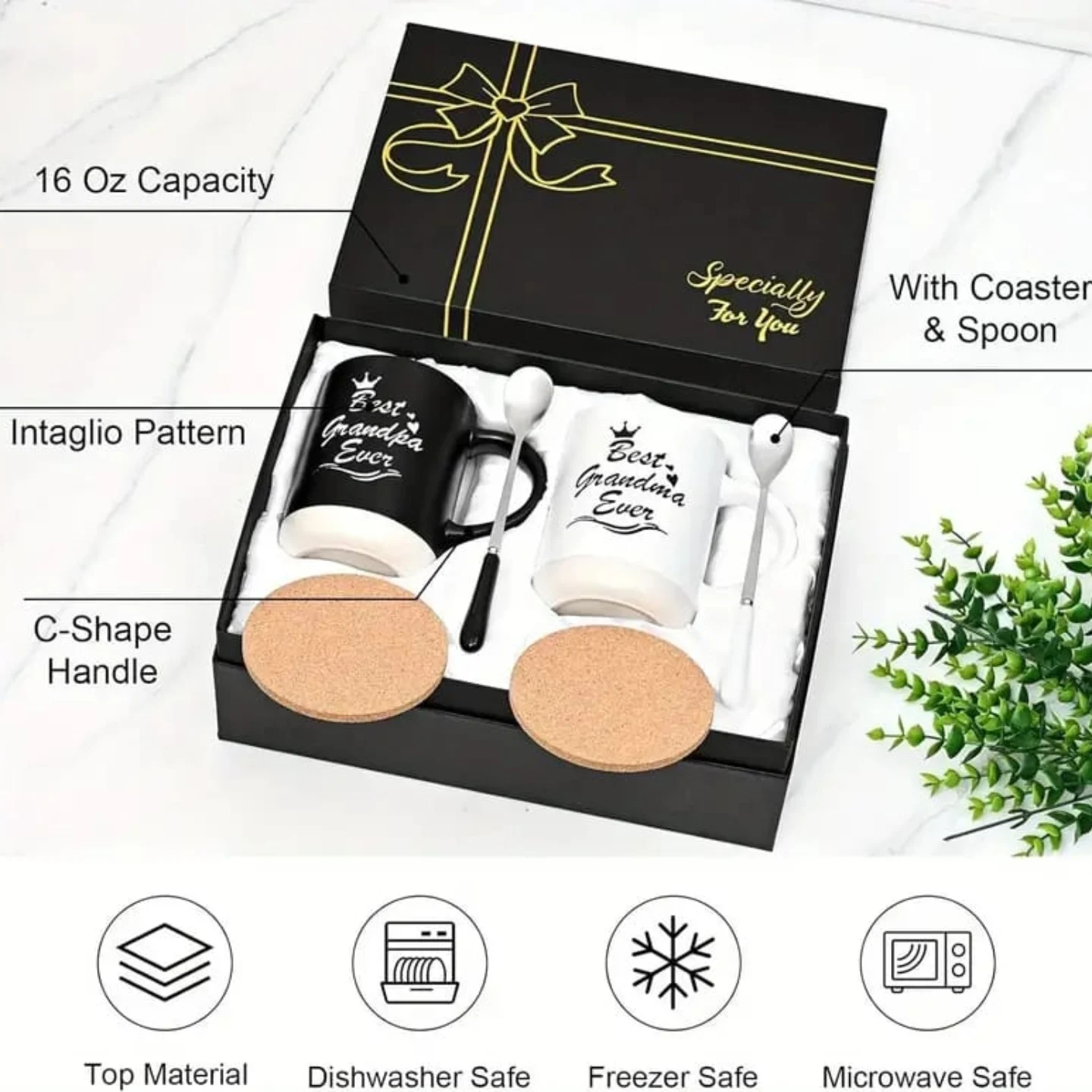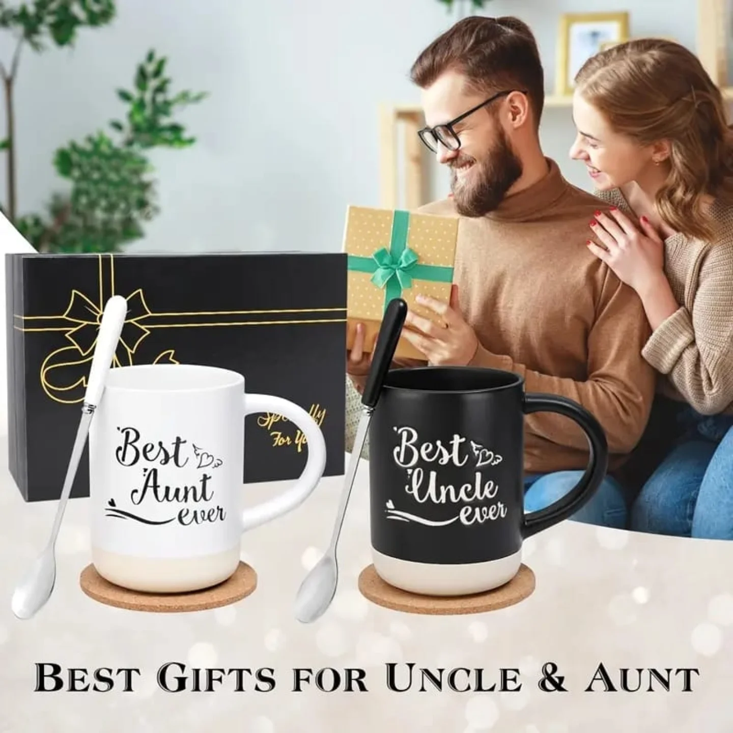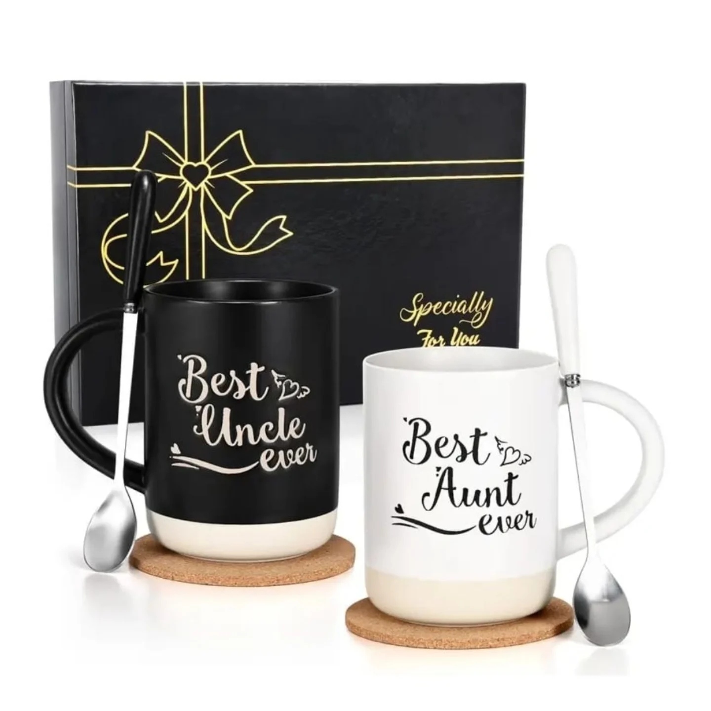 This elegant gift set features two ceramic mugs, two spoons, and two wooden coasters, beautifully presented in a black gift box. One mug is black with ‘Best Uncle ever’ printed, and the other is white with ‘Best Aunt ever’ printed, making it an ideal appreciation or thank you gift for a beloved aunt and uncle.