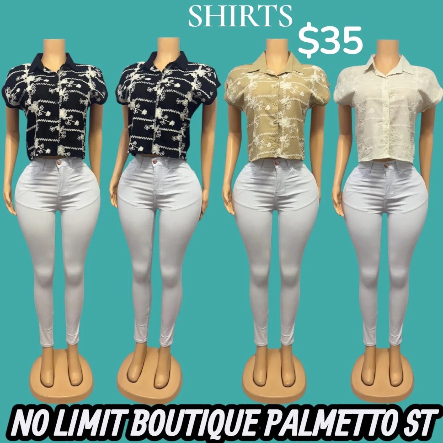 This women’s cropped shirt features a collared neckline and short sleeves with a button-up front. Available in black and white floral print, khaki floral print, and white floral print. This stylish top is perfect for a casual or dressed-up look.