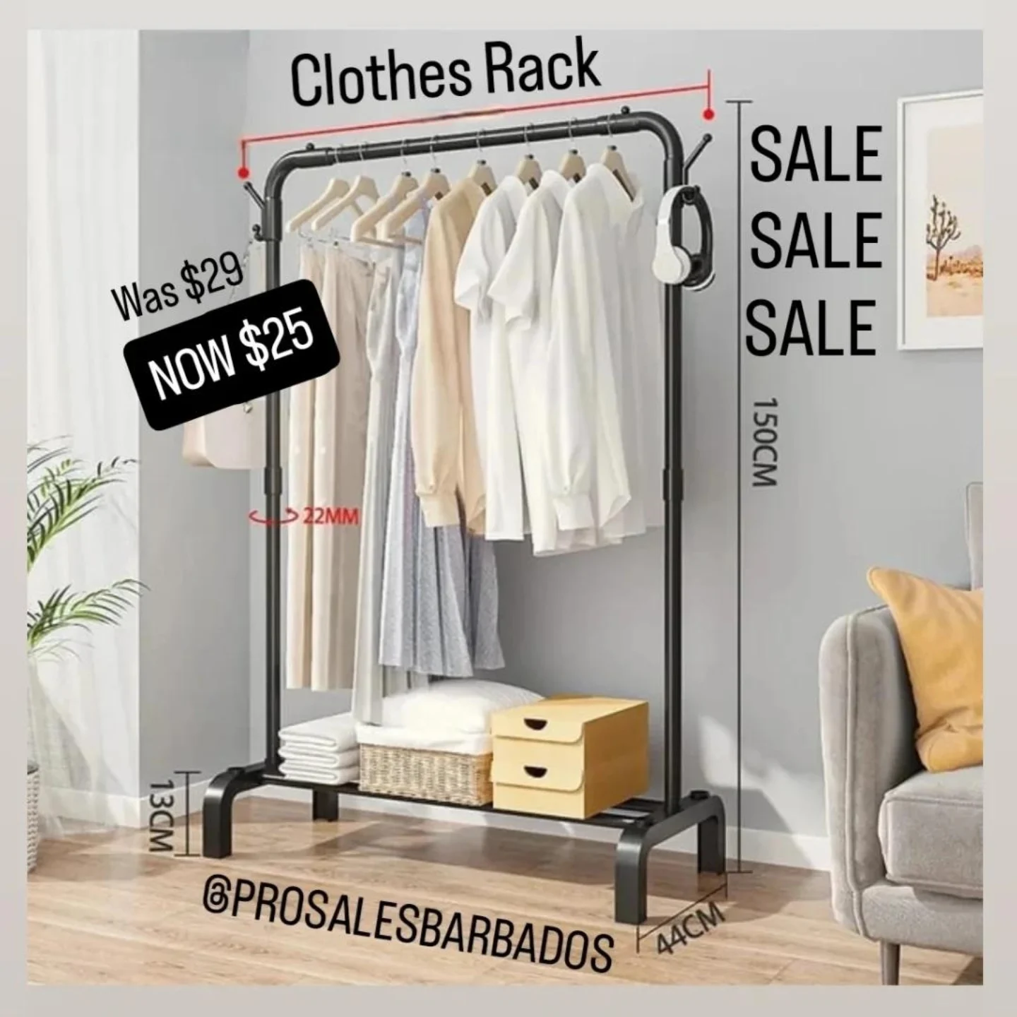 This clothes rack features a sturdy black frame suitable for organizing your wardrobe. It includes multiple levels for hanging clothes and storing accessories. Assembly is required for setup.