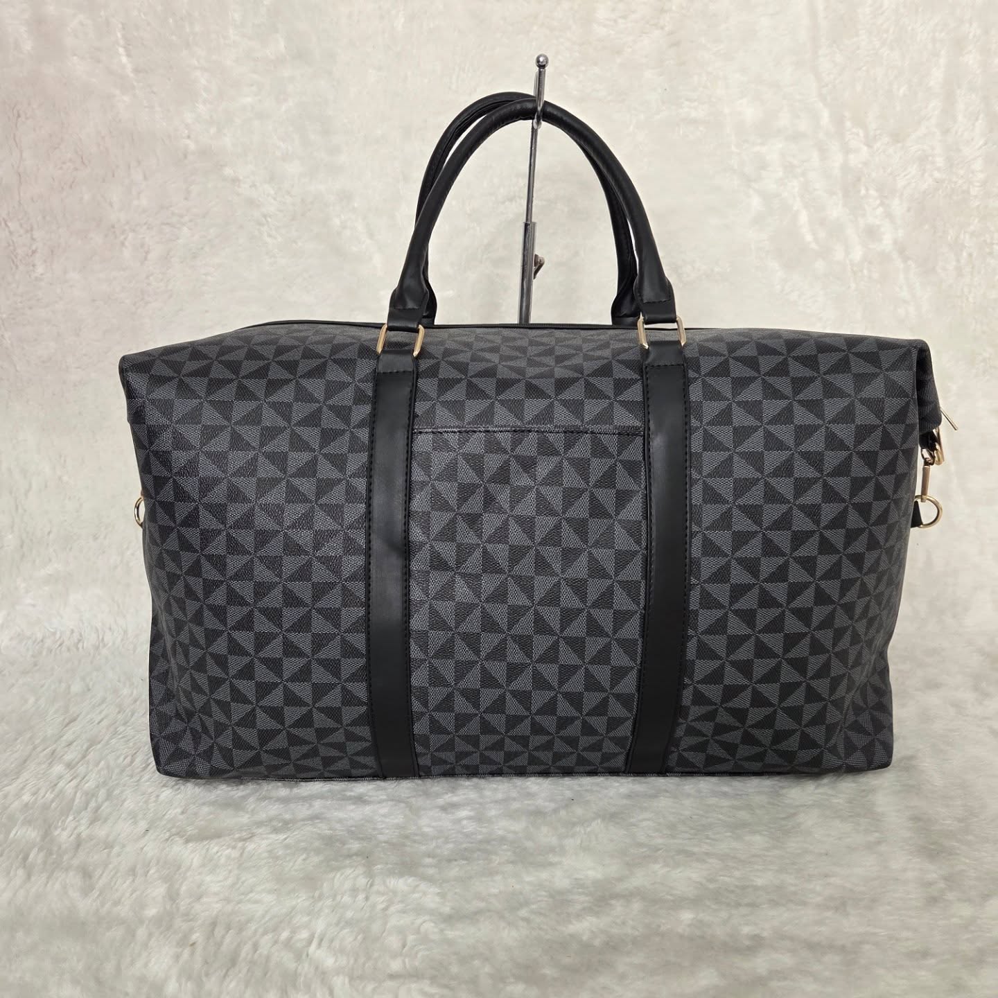This sleek black duffle bag features a geometric pattern with sturdy leather handles and accents. Perfect for travel or gym use, it’s spacious enough to fit all essentials comfortably.