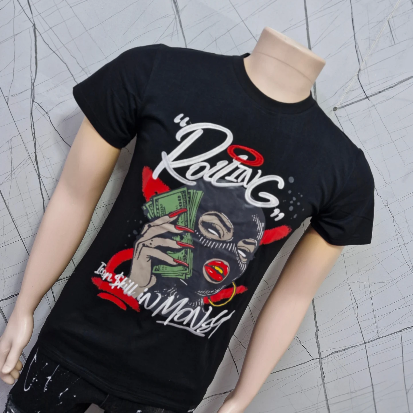 This black t-shirt features a graphic print with the text “Rolling” and an image of a person wearing a ski mask and holding money. The print also includes the text “Ion Still In Money”. This is a short-sleeved, crew neck t-shirt. Material is not specified.