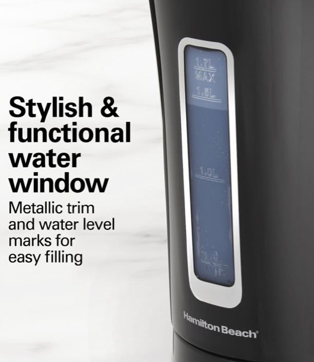 Prepare hot beverages and instant meals quickly with the Hamilton Beach Electric Kettle. This high-performance water kettle features 1500 watts of power for rapid boiling, ideal for hectic mornings. The appliance offers peace of mind with automatic shutoff and boil-dry protection. It is constructed with a BPA-free interior for worry-free use. This 1.7L black electric kettle is a stylish and functional addition to any kitchen.