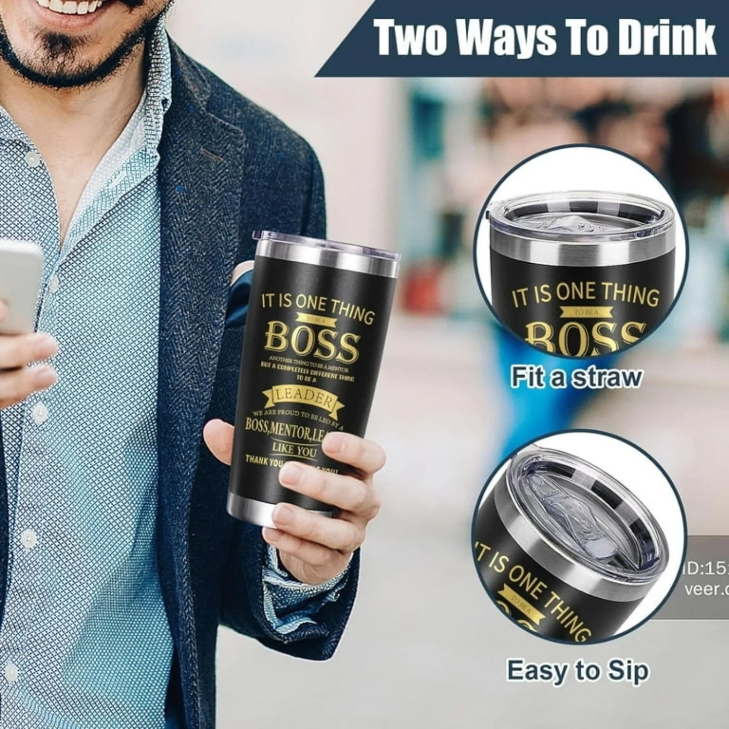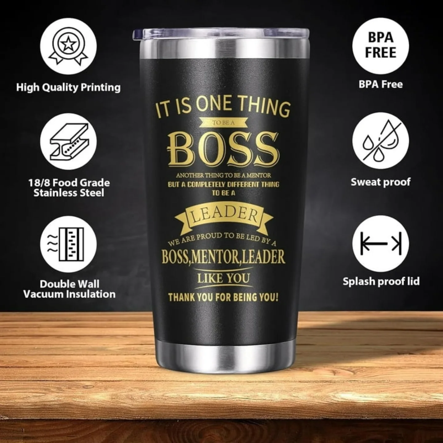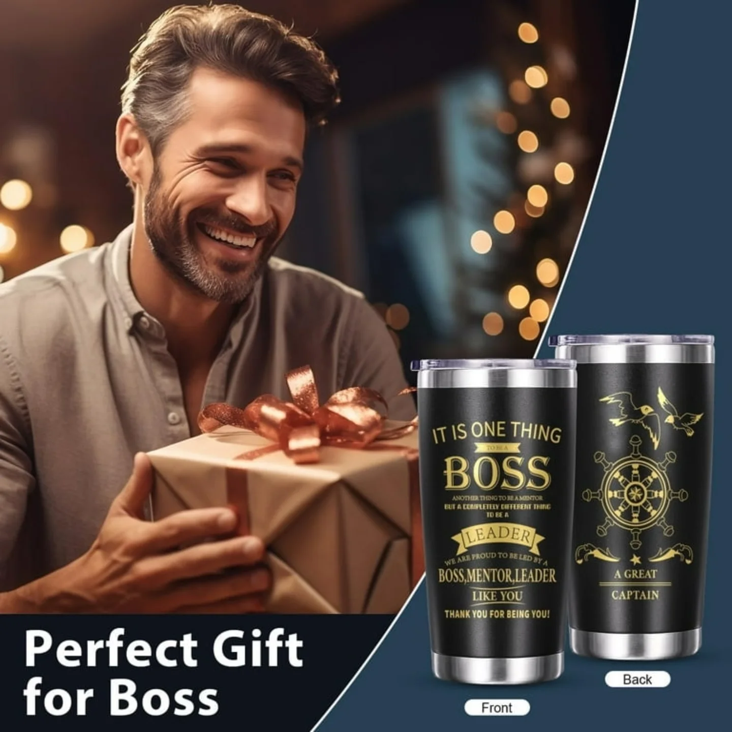 This black double-wall vacuum insulated stainless steel travel tumbler is designed as a thoughtful appreciation gift for a boss, mentor, or leader. Featuring gold text and graphics, one side celebrates a ‘Boss, Mentor, Leader’ and the other depicts a ship’s wheel and birds with ‘A Great Captain’. It holds 20oz and is suitable for both hot and cold beverages.