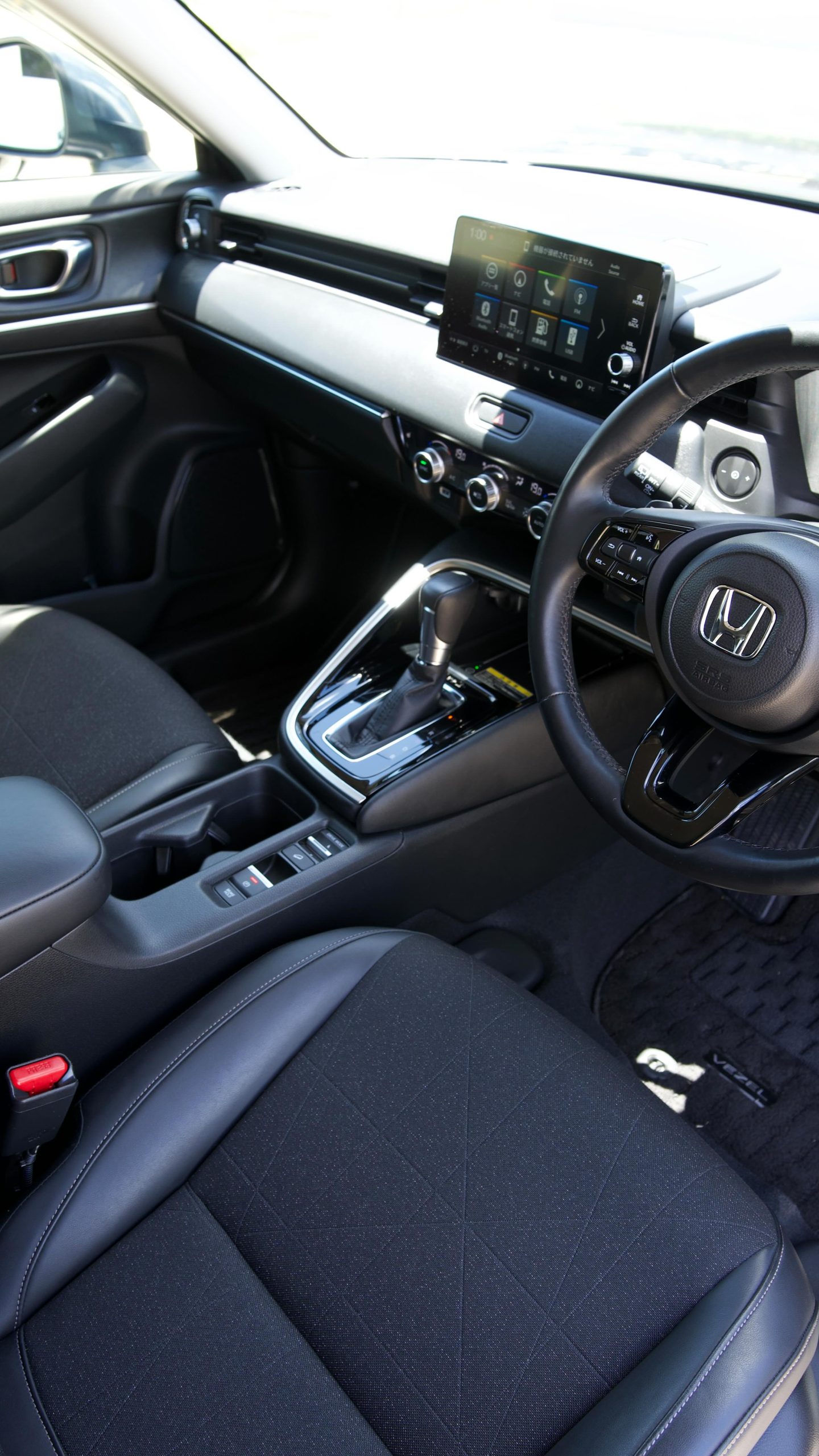Experience the modern and feature-rich interior of the 2022 Honda Vezel Hybrid SUV. This vehicle boasts a sophisticated cabin with comfortable black seating, a large infotainment system supporting Apple CarPlay and Android Auto, and a multi-function steering wheel. Key features include push start, keyless entry, reverse camera, wireless charging, and a suite of advanced safety systems like Collision Mitigation Braking and Lane Departure Assist.