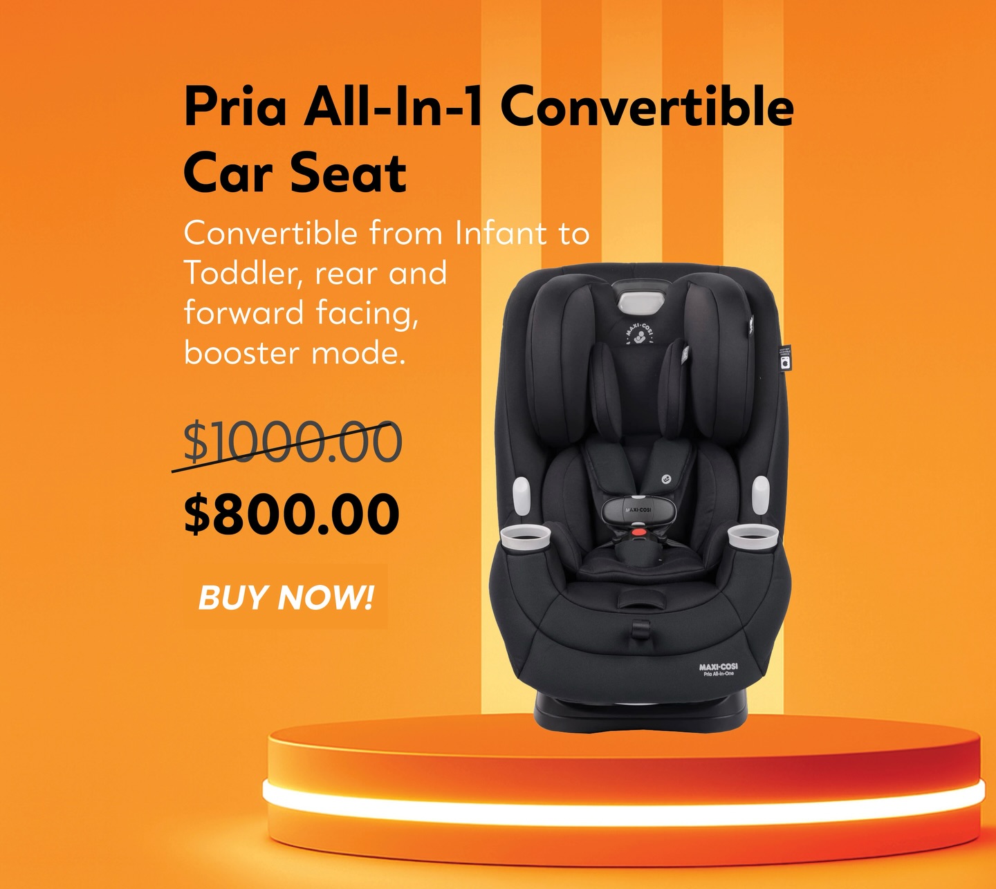 The Maxi-Cosi Pria All-In-1 Convertible Car Seat in black is a versatile solution designed to grow with your child. It functions as an infant car seat, toddler car seat, and booster, supporting both rear-facing and forward-facing modes for comprehensive safety and comfort.