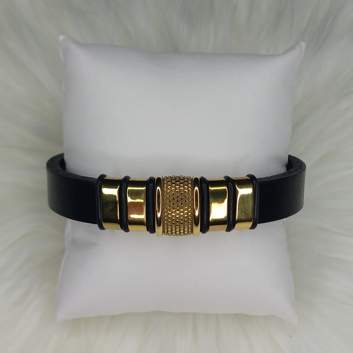 This durable men’s bracelet features a sleek black leather strap adorned with polished gold-toned stainless steel accents, including a textured central bead. It’s an affordable and stylish accessory, perfect for everyday wear or as a thoughtful gift.