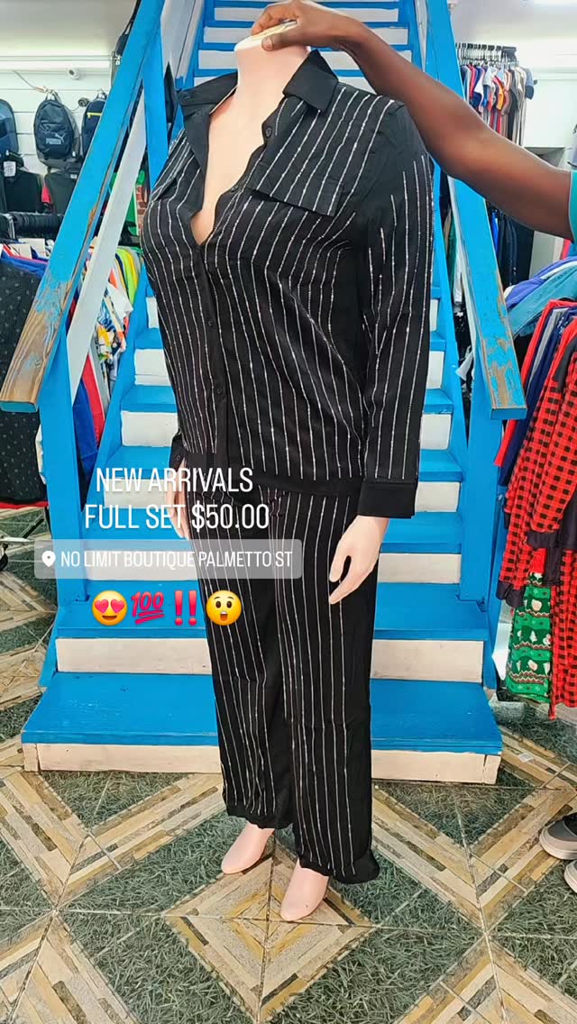 This is a black pinstripe pajama set for women. The set includes a long-sleeved collared shirt and matching pants. It is available as a full set for $50.00. Keywords: black, pinstripe, women’s, pajama set, long sleeve, collared shirt, pants.