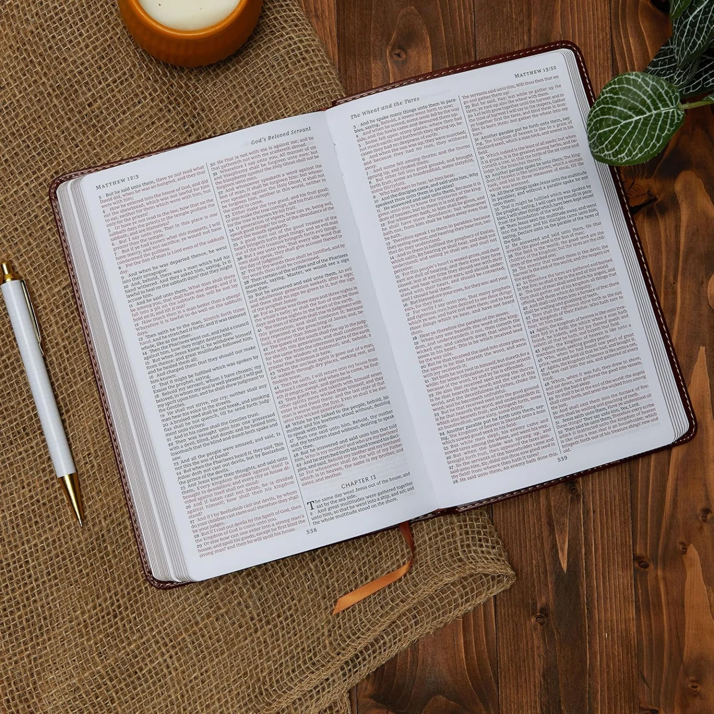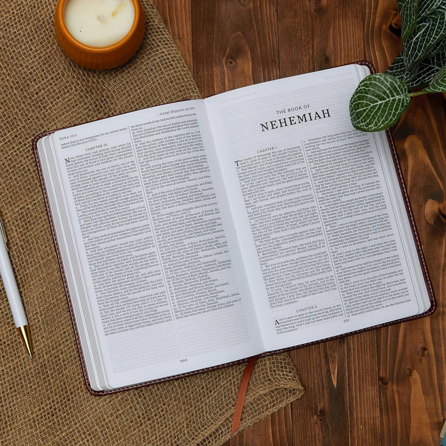 This KJV Holy Bible, a worldwide bestseller from Thomas Nelson, features a durable black leather-look cover and the exclusive Comfort Print® typeface for an enhanced reading experience. It includes Words of Christ in red, a dictionary, concordance, reading plans, and full-color maps, making it an ideal gift or award.