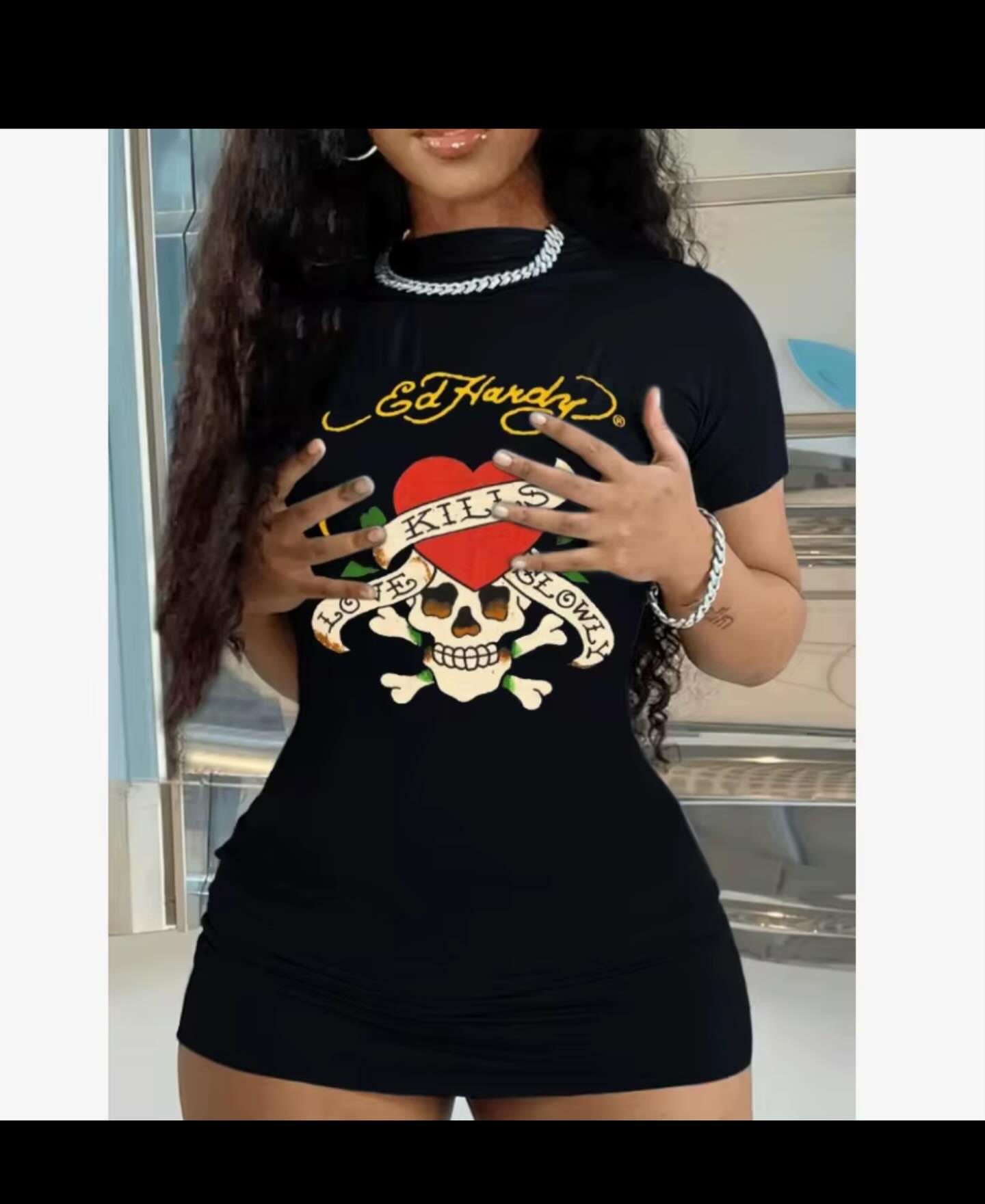 This black Ed Hardy dress features a bold graphic design with short sleeves, suitable for women. Available in sizes small and medium.