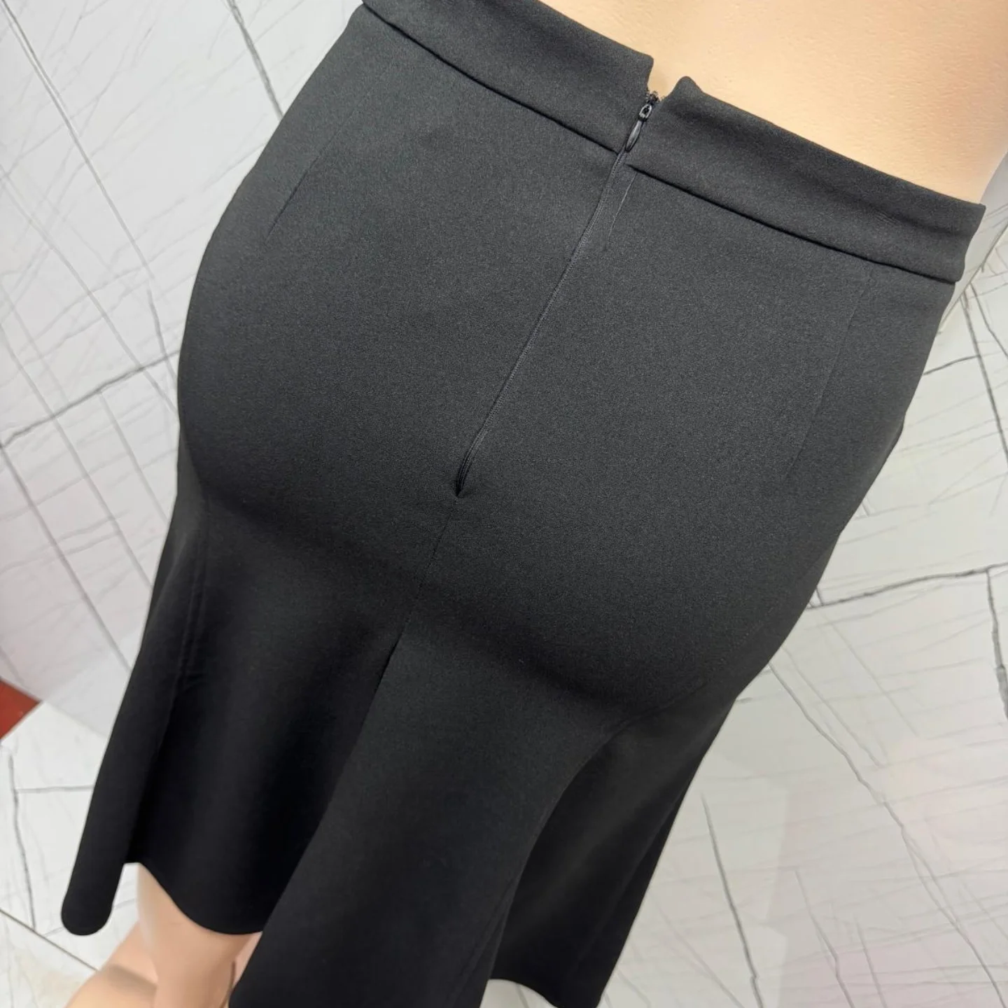 This black women’s flare skirt features a flattering silhouette that is fitted at the waist and hips, gently flaring out towards the hem. Designed for plus-size women, it includes a discreet back zipper closure for a smooth fit.
