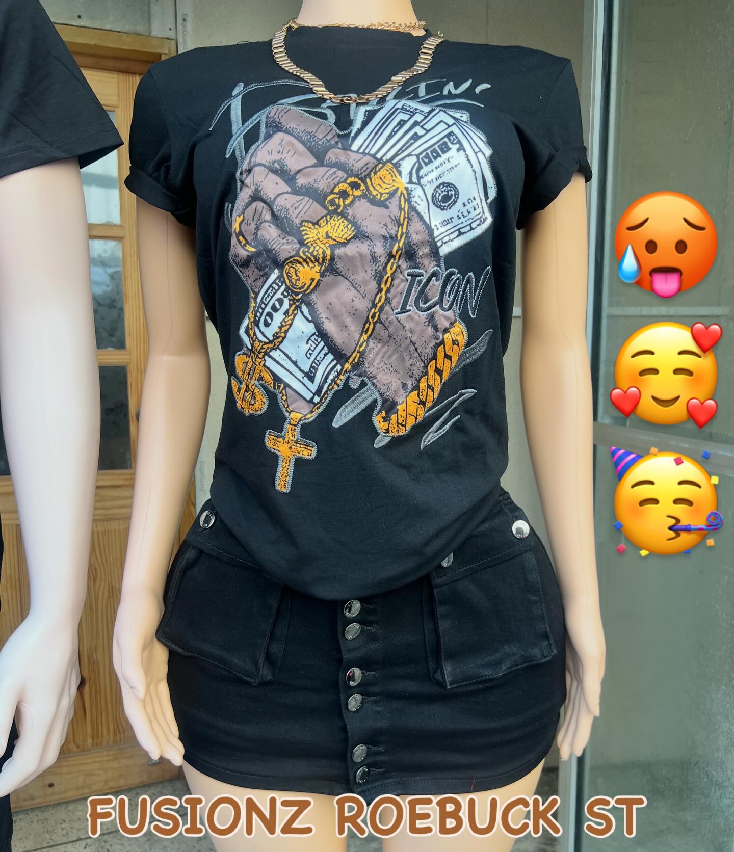 A stylish black women’s set featuring a graphic t-shirt with detailed design and a buttoned mini skirt. Perfect for casual outings with a trendy look.