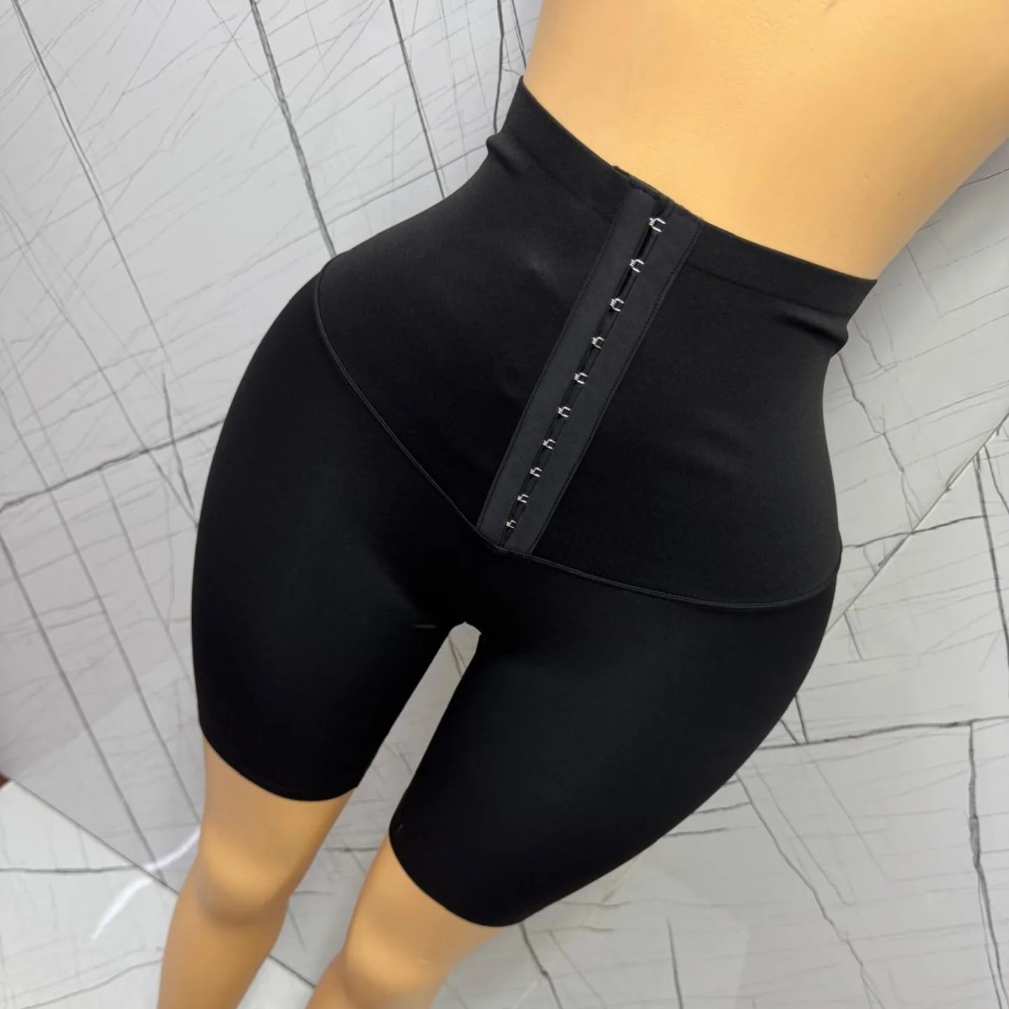 These black high-waisted compression shorts feature a front hook-and-eye closure for adjustable support and a smooth silhouette. Crafted from a stretchy fabric, they are designed to provide comfortable shaping and tummy control.