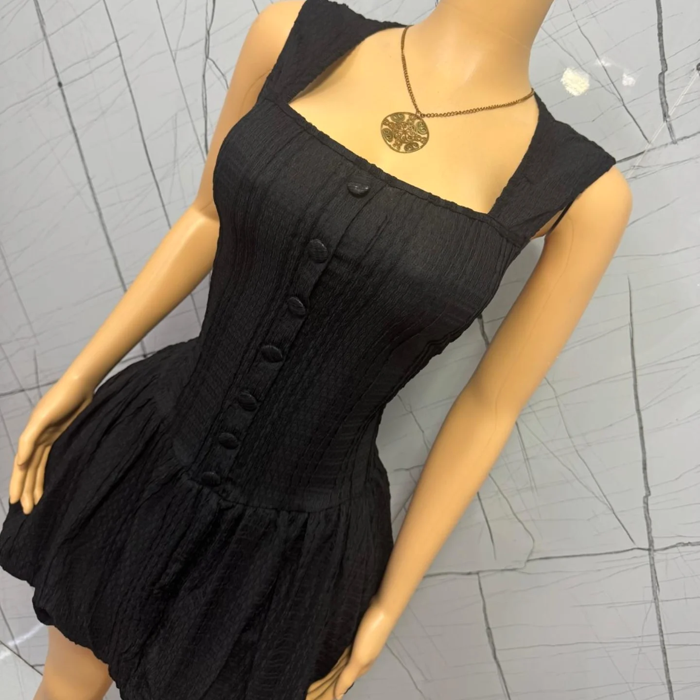 This stylish black women’s mini dress features a flattering square neckline and wide straps. The fitted bodice is adorned with a row of buttons, and the entire dress showcases a unique textured, crinkled fabric. Its short, gathered skirt creates a playful, voluminous silhouette, perfect for a chic casual look.