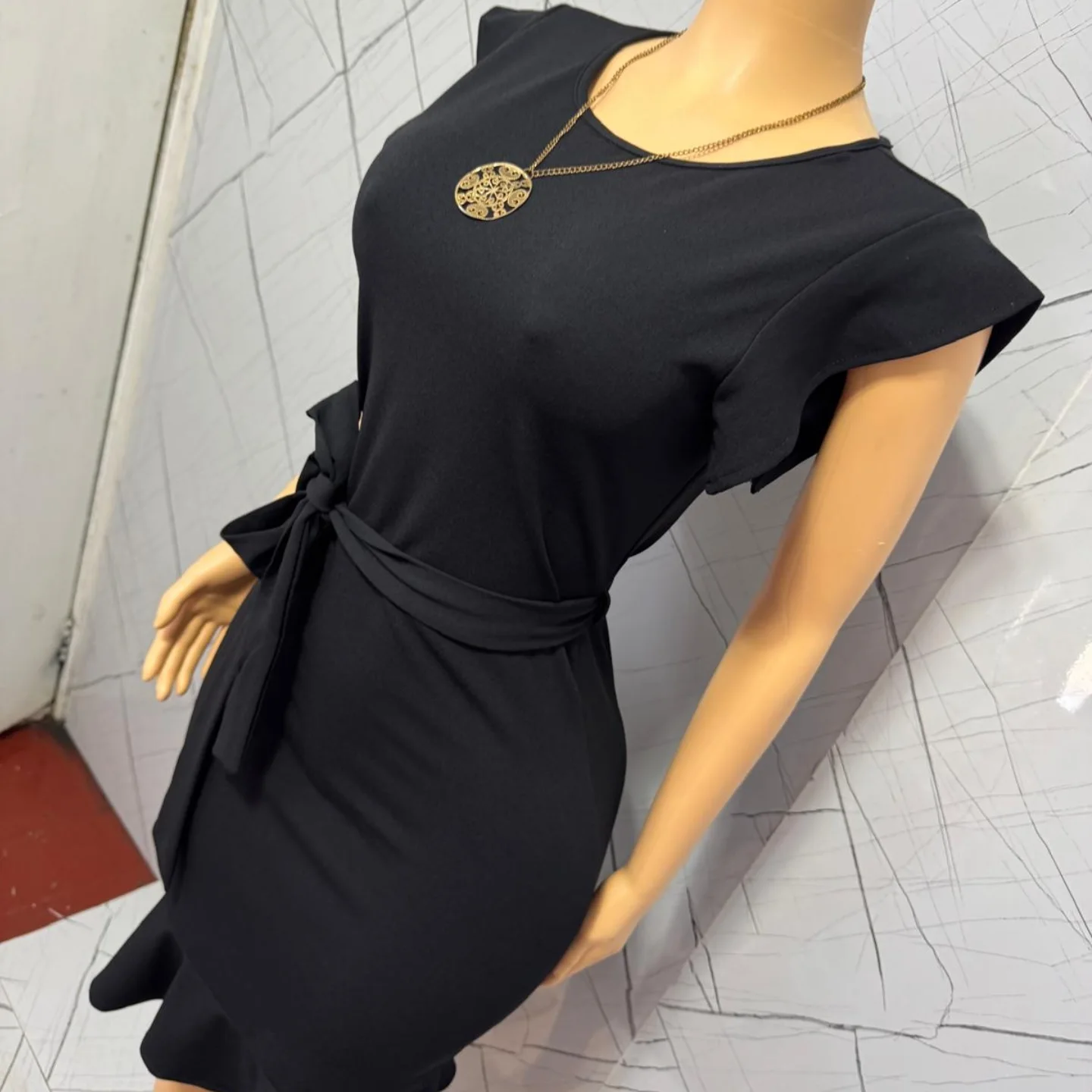 This elegant black women’s work dress features delicate ruffled cap sleeves and a flattering tie-waist belt. Crafted from a soft, comfortable fabric, it offers a sophisticated silhouette suitable for professional settings or semi-formal occasions. Available in store as part of new arrivals.