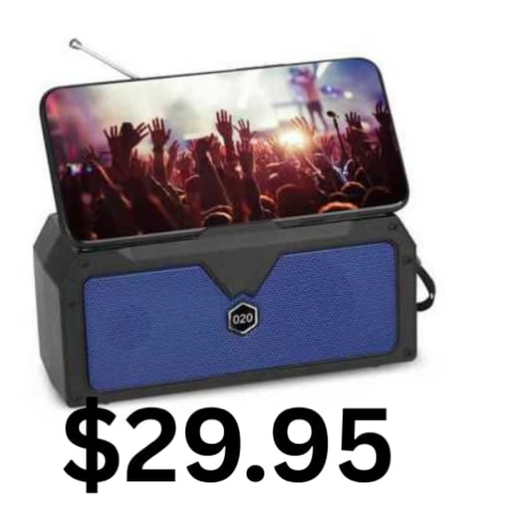 This portable Bluetooth speaker features a robust black casing with a blue mesh front, designed for on-the-go audio. It includes a convenient top slot to securely hold a smartphone and an extendable antenna, suggesting radio functionality. Ideal for music playback and hands-free viewing.