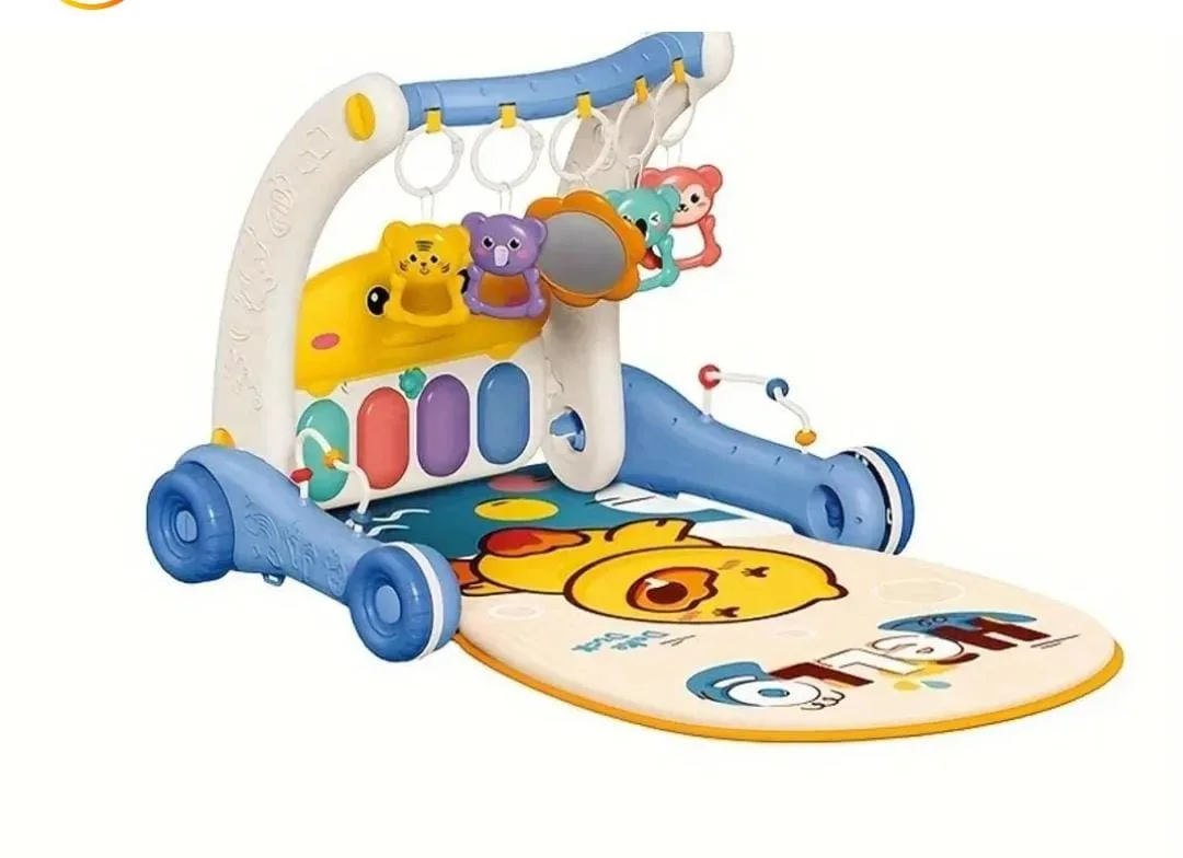 This versatile baby activity center features a colorful piano playmat for kick-and-play fun, an overhead arch with hanging rattles and a mirror for sensory development, and a sturdy frame that converts into a baby walker. Designed with bright blue, yellow, and multi-colored accents, it includes a charming cartoon duck graphic on the mat, perfect for engaging infants during tummy time and early walking stages.