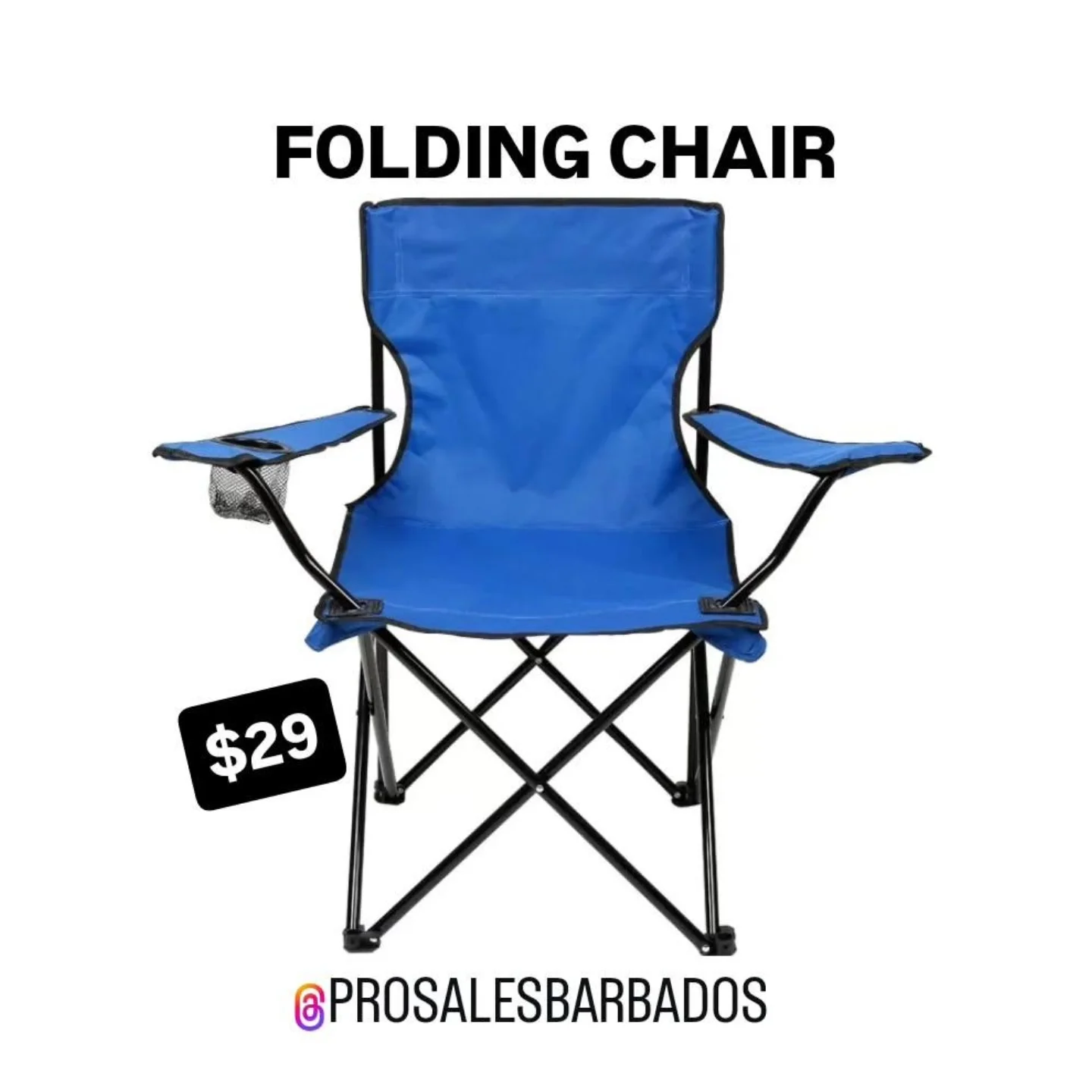 This is a portable blue folding chair ideal for outdoor events and camping. Made with sturdy metal frames and durable fabric, it features armrests with a cup holder for added convenience.