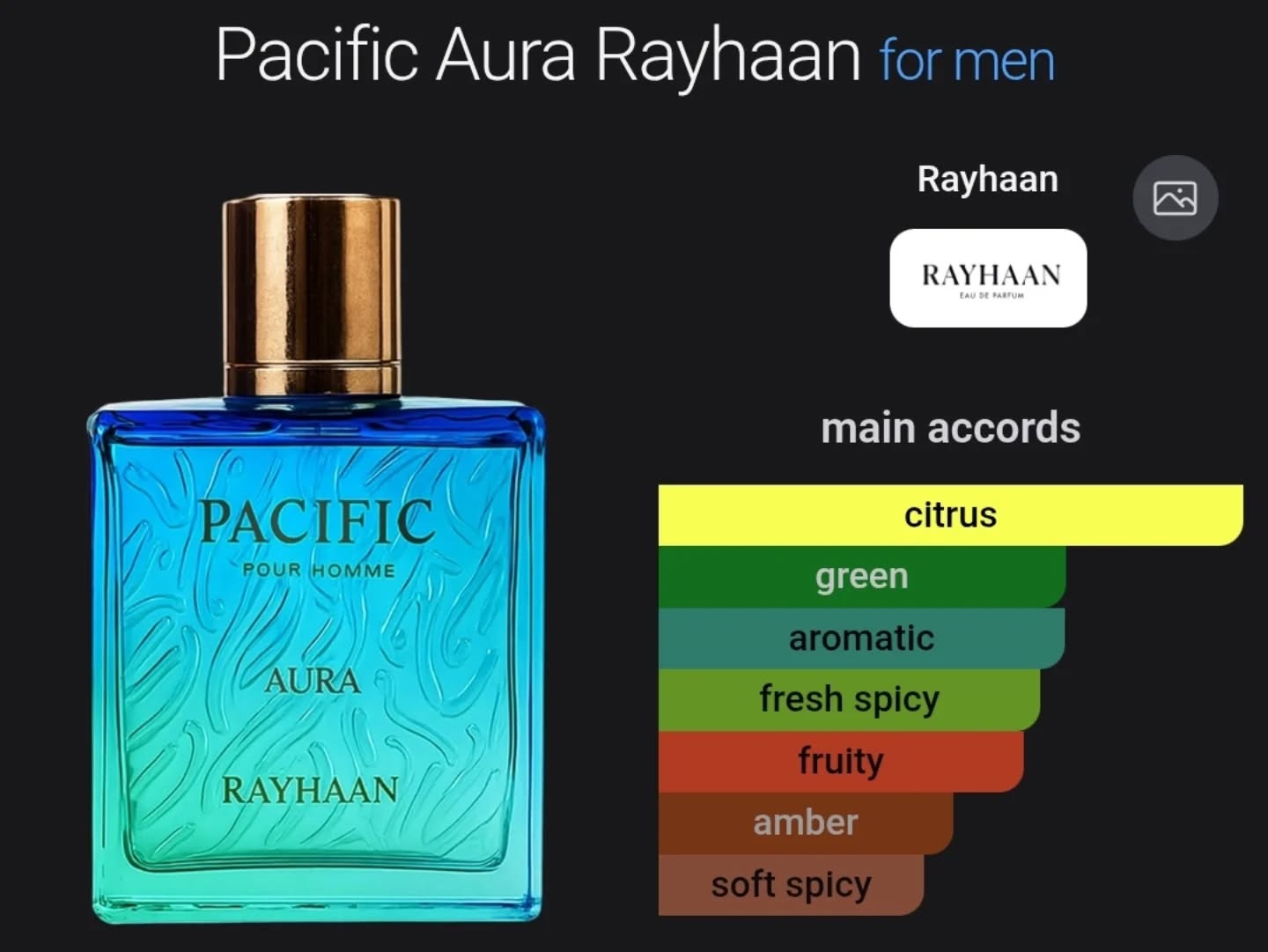 Experience the Rayhaan Pacific Aura Eau de Parfum Spray for men, a vibrant fragrance featuring main accords of citrus, green, aromatic, fresh spicy, fruity, amber, and soft spicy notes. This invigorating scent is available in a 3.4 ounce (100 ml) bottle, perfect for daily wear.