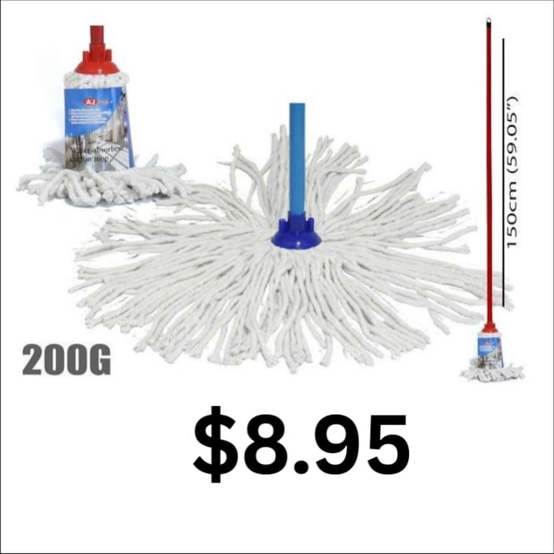 This is a white string mop with a blue handle and a red pole. It measures 150cm (59.05 inches) in length and comes with a 200g mop head. This mop is ideal for cleaning floors and is designed for efficient water absorption.