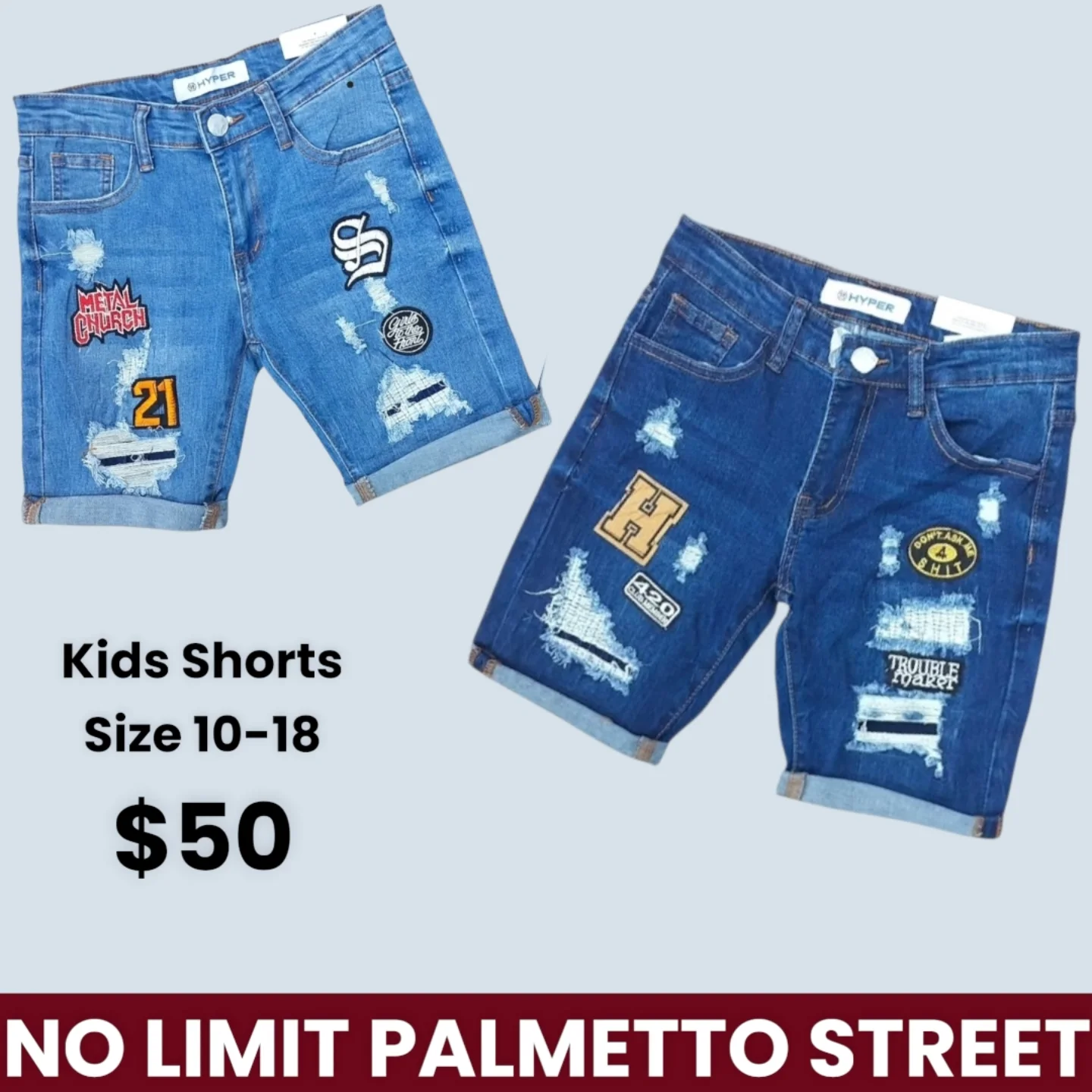 These HYPER kids’ distressed denim shorts feature a comfortable fit and cuffed hems. Each pair is uniquely styled with various embroidered patches, offering a cool and edgy look. Available in sizes 10-18.