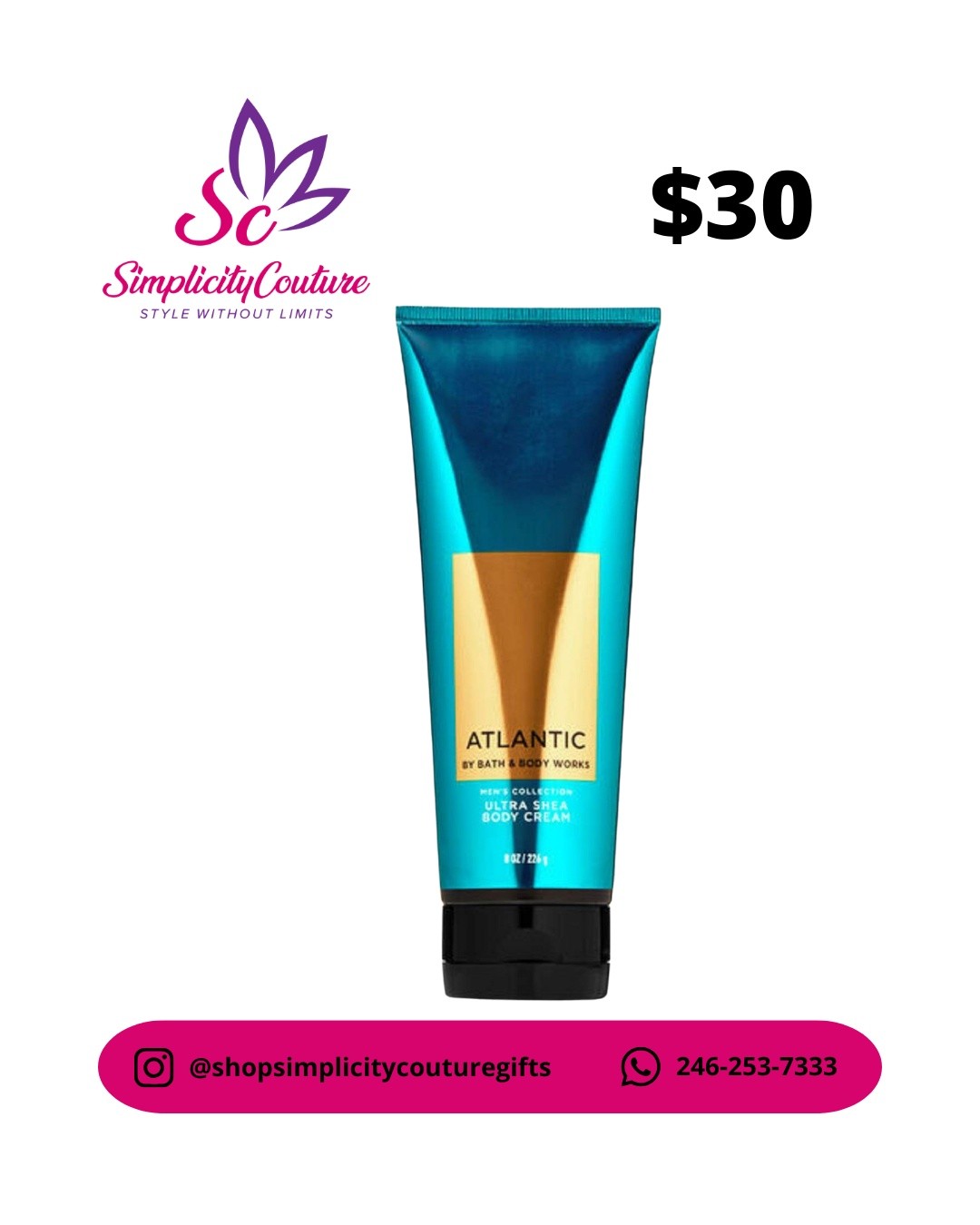This is the Bath & Body Works Men’s Collection Atlantic Ultra Shea Body Cream. It is an 8oz container designed to keep skin smooth and hydrated with a fresh, clean aquatic scent. This moisturizing formula is perfect for everyday grooming and long-lasting moisture.