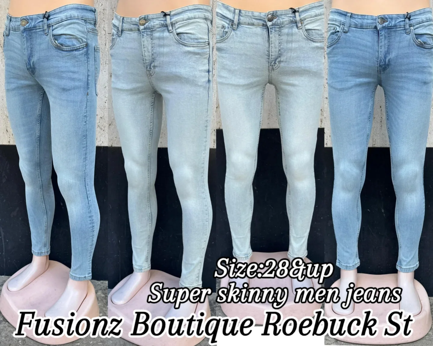 These men’s super skinny jeans from Fusionz Boutique feature a form-fitting style in various shades of blue. Available in sizes starting from 28 and up, these jeans offer a trendy, sleek look suitable for various occasions.