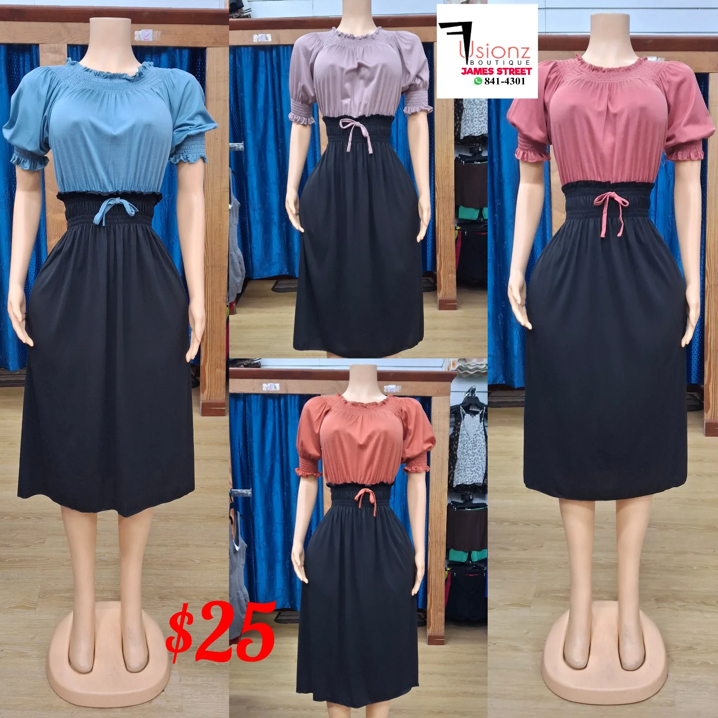 This women’s dress set features a puff sleeve top and a black high-waist skirt. The tops are available in blue, pink, and orange colors, complemented by an elastic waistband and decorative tie. The ensemble offers a classic and versatile style suitable for various occasions.