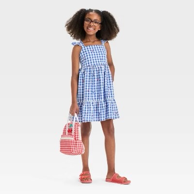 This charming CAT & JACK girls’ dress features a classic blue and white gingham pattern with delicate red floral accents. Designed with a square neckline, wide straps, and a playful tiered skirt, it’s perfect for warm weather. Available in sizes 4/5 and 5/6.