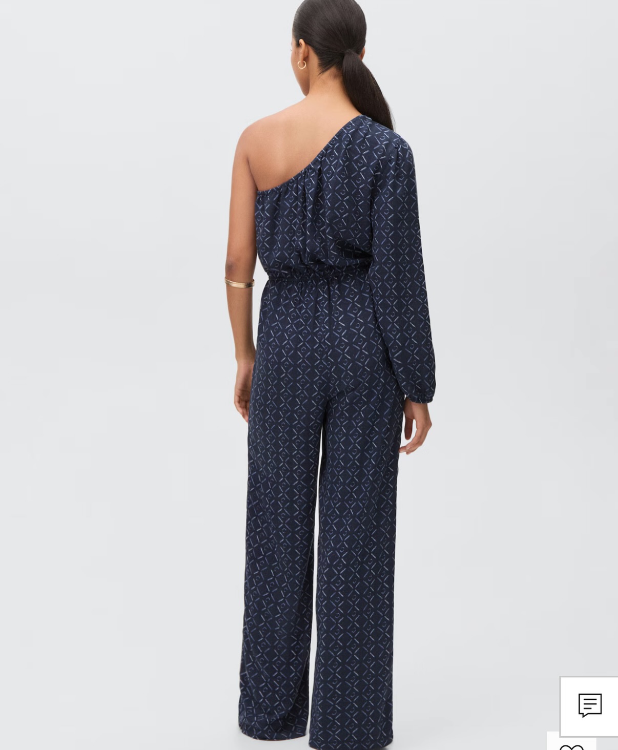 This asymmetric jumpsuit from Mango features a unique one-shoulder design with a geometric pattern. Made for women, the jumpsuit is crafted in a lightweight material that drapes elegantly. Perfect for casual or semi-formal occasions.