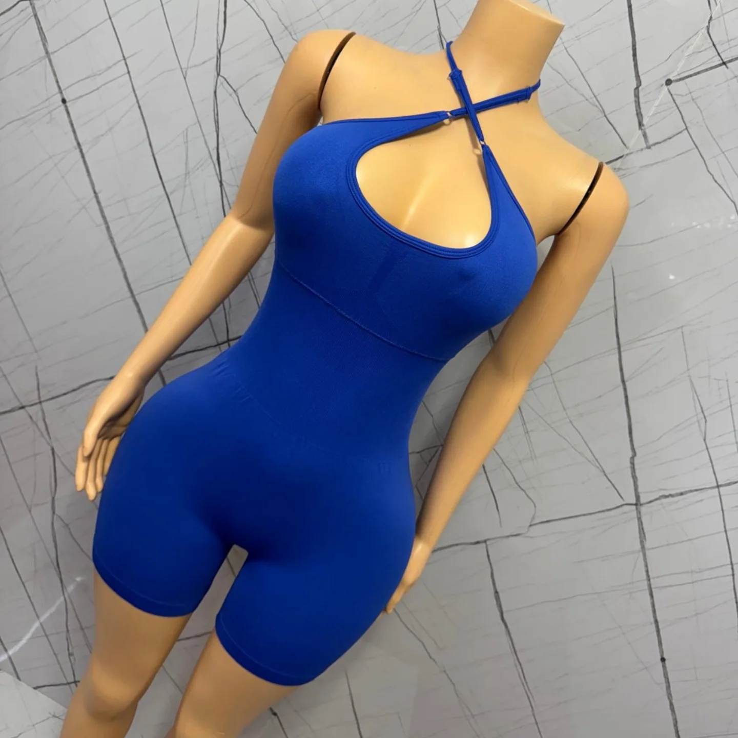 This form-fitting blue women’s bodysuit features a stylish halter neck design with a front cutout detail. The short-length bottom and ribbed texture offer a comfortable yet flattering silhouette, perfect for casual wear or layering.