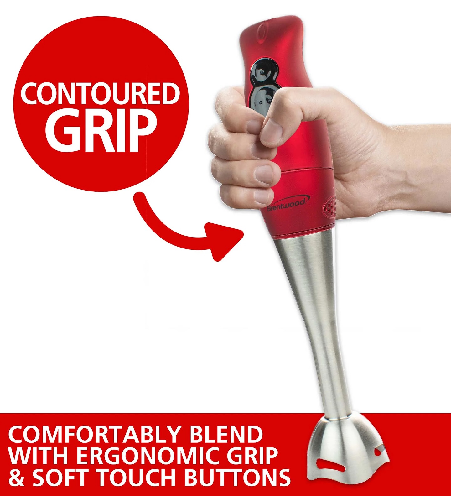 The Brentwood HB-33R 2-Speed 200W Hand Blender features a vibrant red finish and a durable stainless steel blending shaft and blades. Designed for crushing, blending, pureeing, and mixing, it includes an ergonomic soft grip, an extra-long 5ft cord, and a dishwasher-safe removable shaft for easy cleaning. Ideal for various food prep tasks.