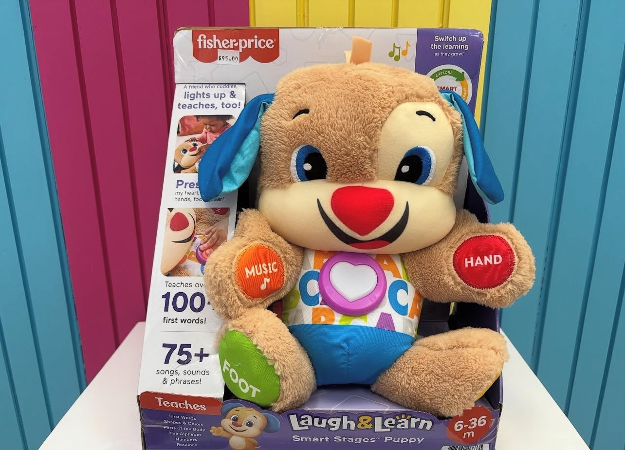 The Fisher-Price Laugh & Learn Smart Stages Puppy is an interactive plush toy designed for babies and toddlers aged 6-36 months. This educational puppy toy features a light-up heart and teaches over 100 first words and 75+ songs, sounds, and phrases through its Smart Stages technology.