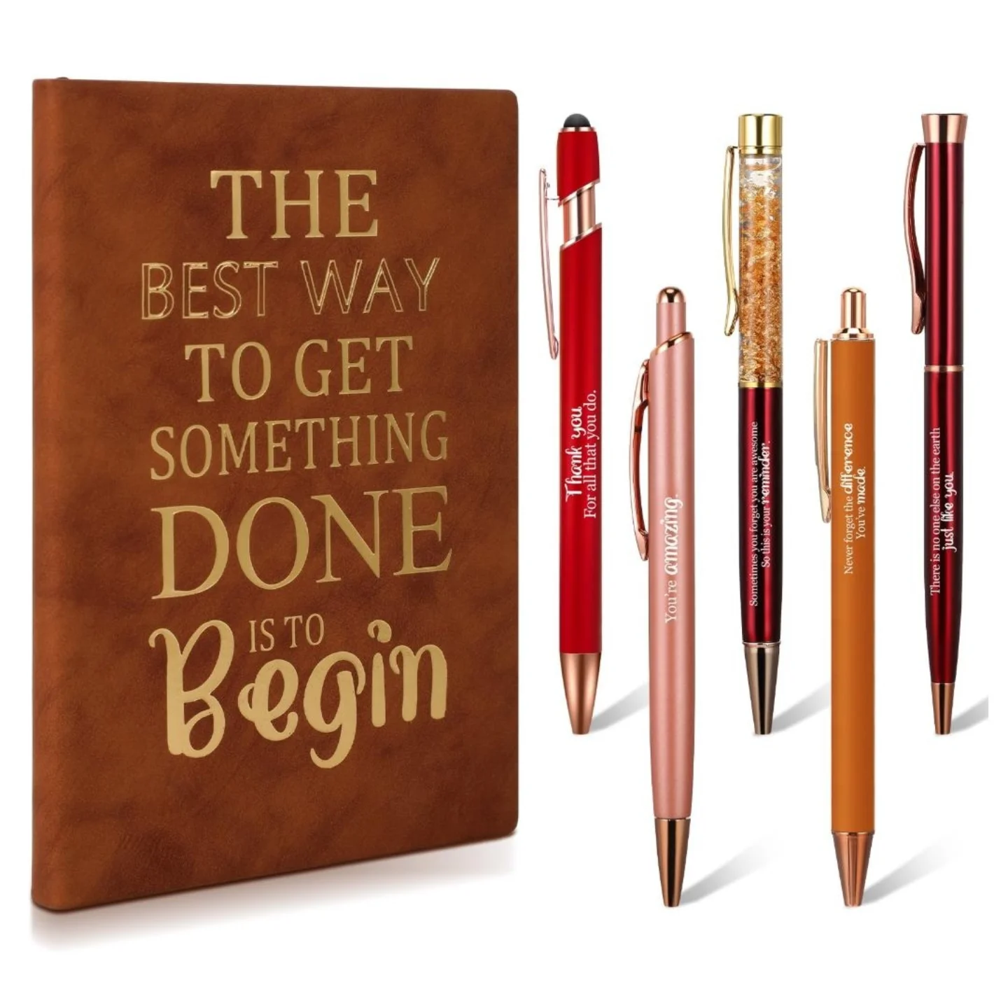 This inspirational gift set includes an 8×5 journal with the quote “The Best Way To Get Something Done Is To Begin” and five gold and bronze themed pens. Perfect for friends, colleagues, or family, this set is designed to inspire productivity. Available at Heartening Gifts.